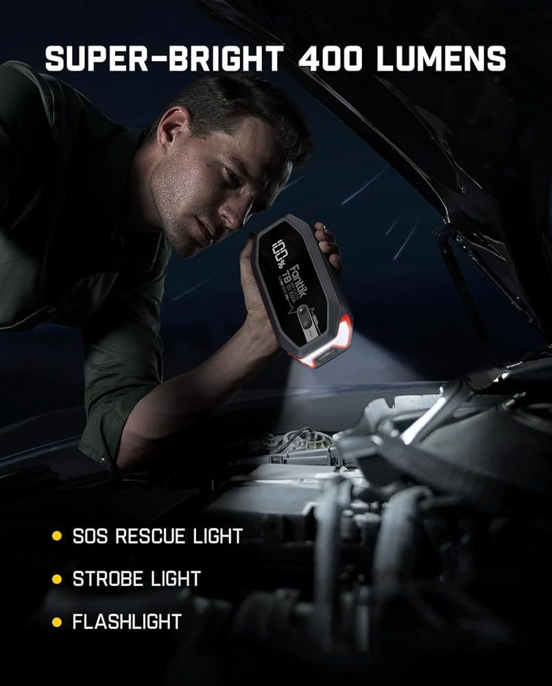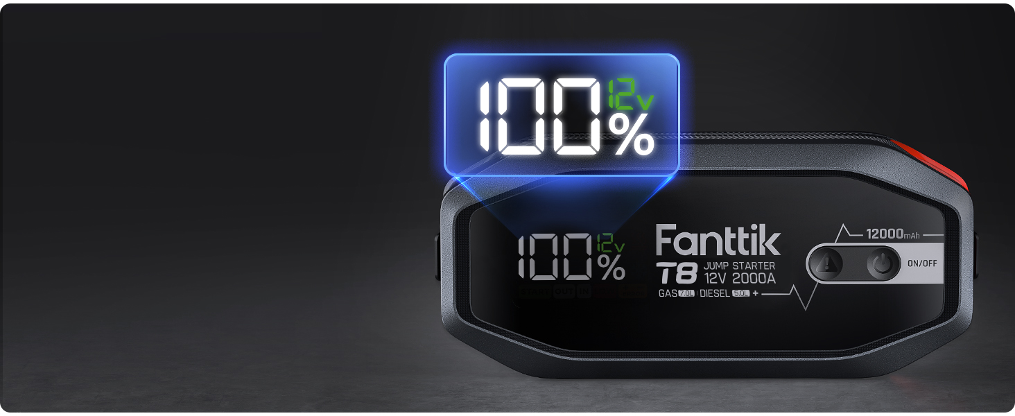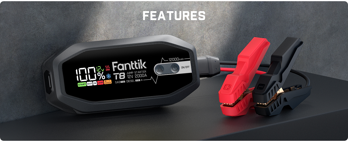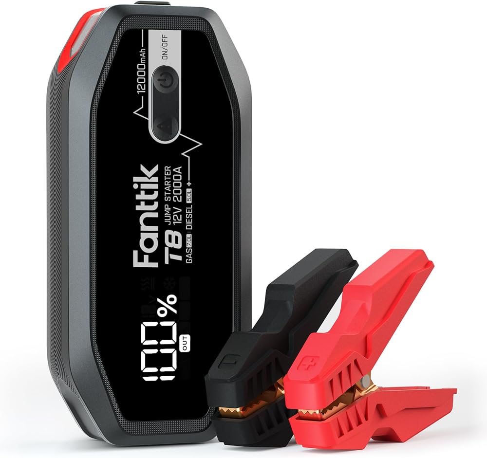 FANTTIK T8 2000 Amps Jump Starter، حزمة بطارية سيارة 12000 مللي أمبير في الساعة لما يصل إلى 7.0 لتر من البنزين ومحركات ديزل 5.0 لتر مع شاشة LED، شحن سريع 30 وات، بادئ تشغيل سريع آمن للغاية من الليثيوم 12 فولت