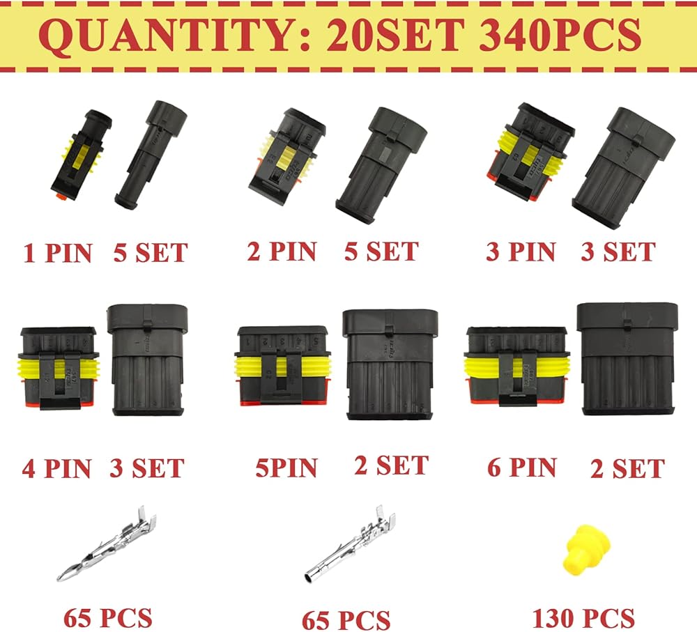 20 مجموعة 340 قطعة من الموصلات الكهربائية المقاومة للماء، مجموعة قابس موصل الأسلاك الكهربائية الأوتوماتيكية، 1/2/3/4/5/6 دبوس ذكر وأنثى قابس محطات موصل مقاوم للماء للدراجات النارية والشاحنات - 20 مجموعة
