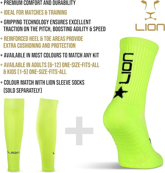 مجموعة Lion Kids لكرة القدم تتضمن جوارب للإمساك وواقيات صغيرة للساق وأكمام جورب - المجموعة المثالية للاعبي كرة القدم الشباب