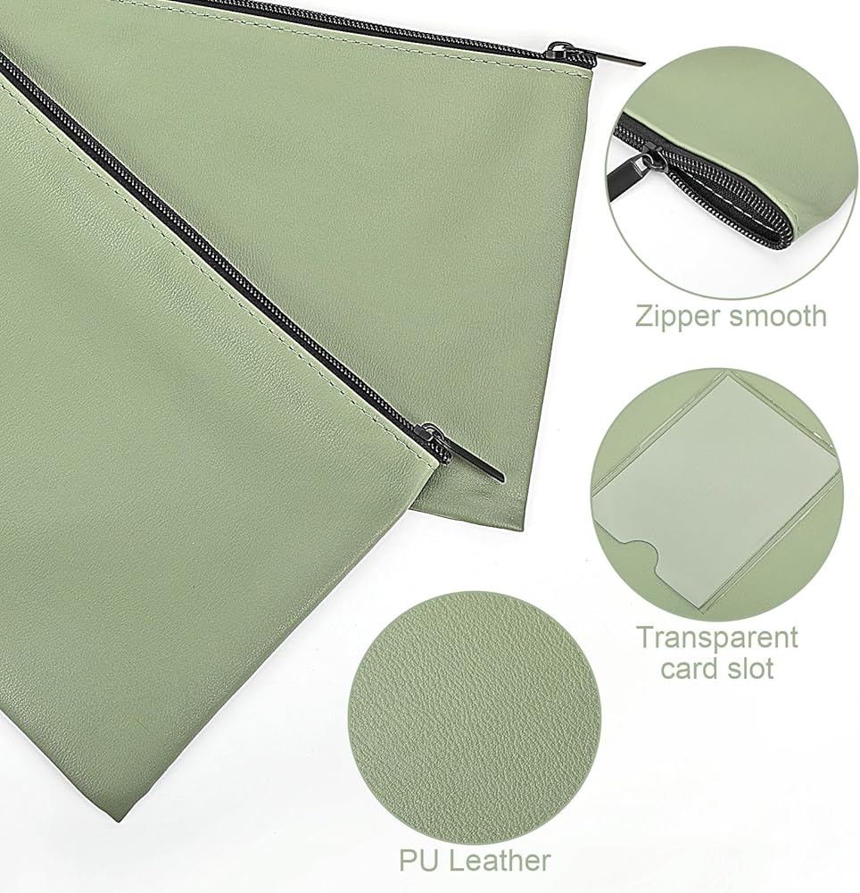 6 Pack 11×6 inch Money Bags With Zipper Green Cash Envelopes PU Leather Cash Bag Check Wallet Receipt Holder Durable Security Money Pouch Large Bank Deposit Bag with Label For Coins Cosmetics Invoice