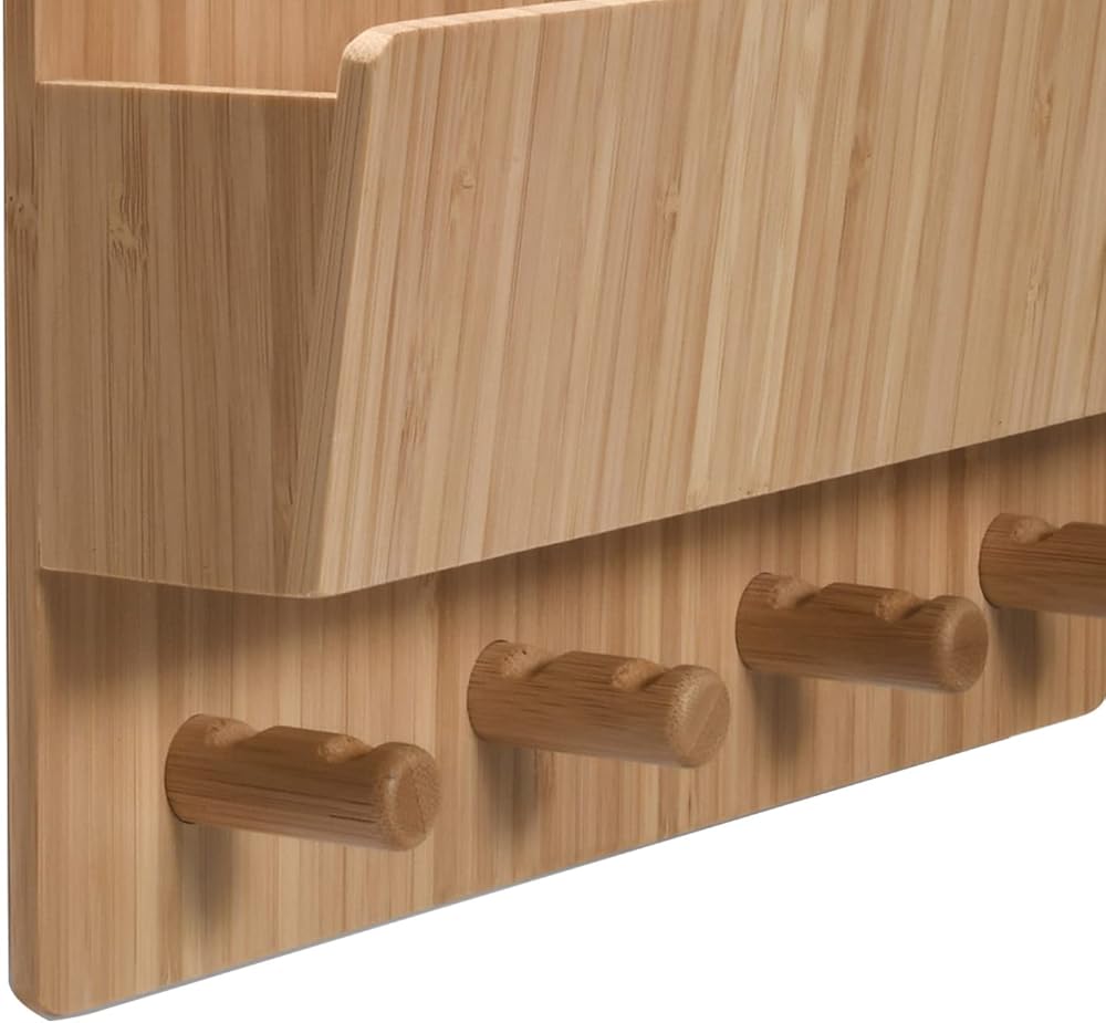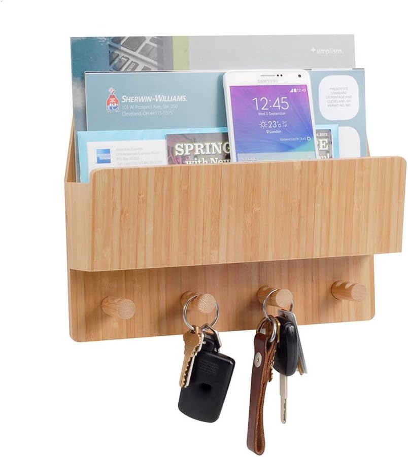 منظم تثبيت على الحائط للبريد والرسائل من الخيزران من MobileVision مع خطافات مفاتيح للمداخل والممرات والمكاتب والمطابخ والمزيد