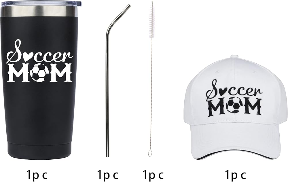 هدايا أمهات كرة القدم: أفضل هدايا أمهات كرة القدم للنساء خاصة لأم كرة القدم. تتضمن مجموعة هدايا Soccer Mom كوبًا واحدًا لأم كرة القدم مع كلمات مطبوعة لـ "Soccer Mom" بالإضافة إلى القش وفرشاة التنظيف، وقبعة واحدة لأم كرة القدم مع كلمات مطبوعة لـ "Soccer Mom".