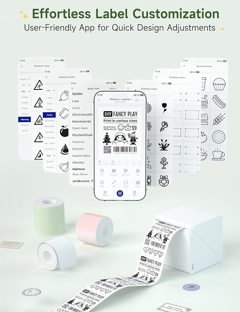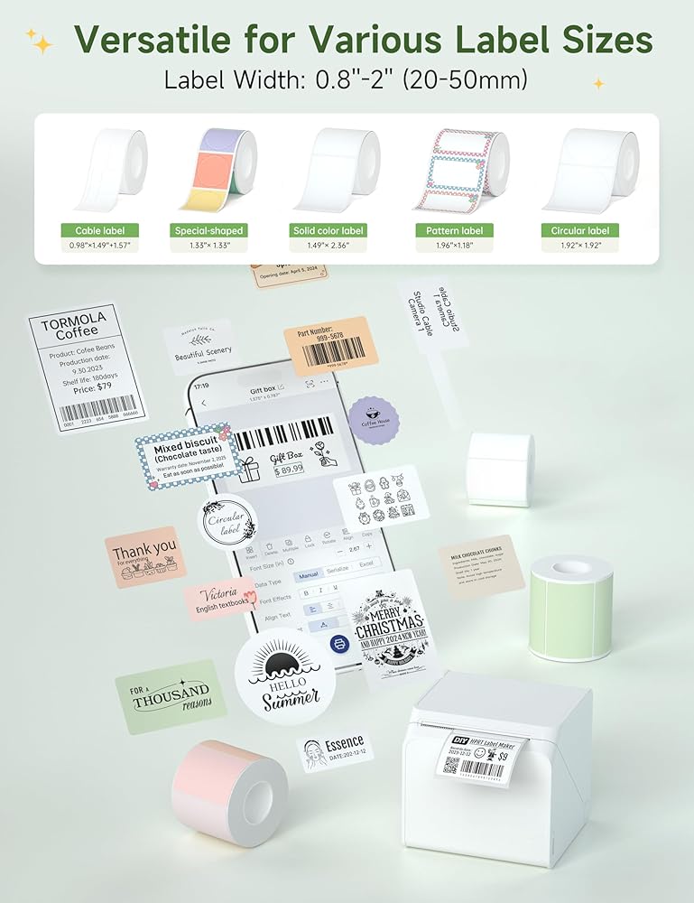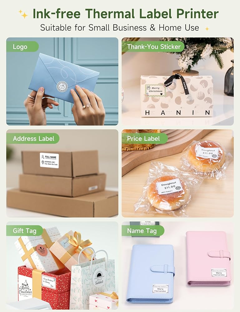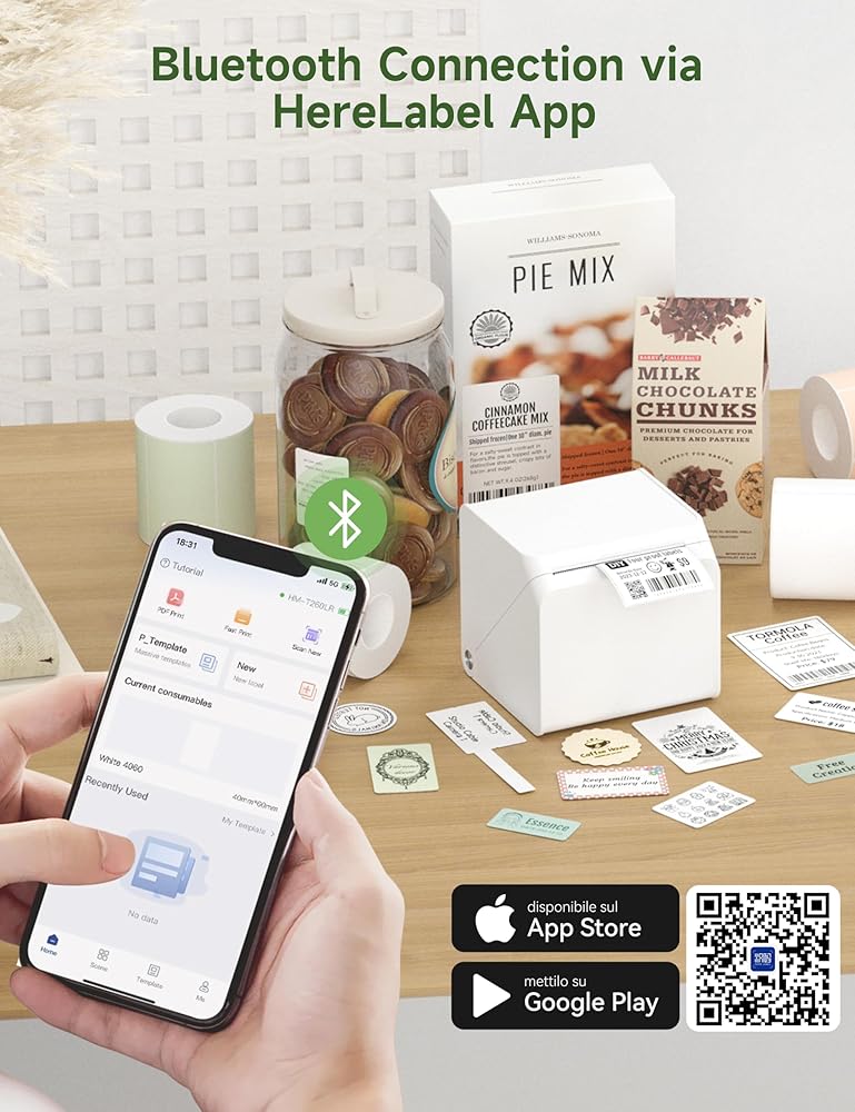 • اتصال Bluetooth: استمتع براحة الطابعة اللاسلكية مع صانع ملصقات Bluetooth الخاص بنا. يُعد صانع الملصقات هذا مثاليًا لتنظيم المنزل واللوازم المكتبية، ويتيح لك الطباعة مباشرة من هاتفك المحمول. بالإضافة إلى ذلك، أصبح تخصيص الملصقات أمرًا سهلاً مع تطبيق HereLabel، المتاح للتنزيل على متجر التطبيقات. استمتع بسهولة الطباعة اللاسلكية وصنع الملصقات بكفاءة مع منتجنا