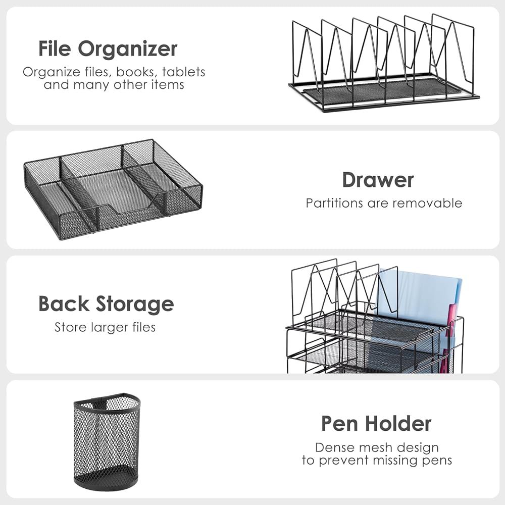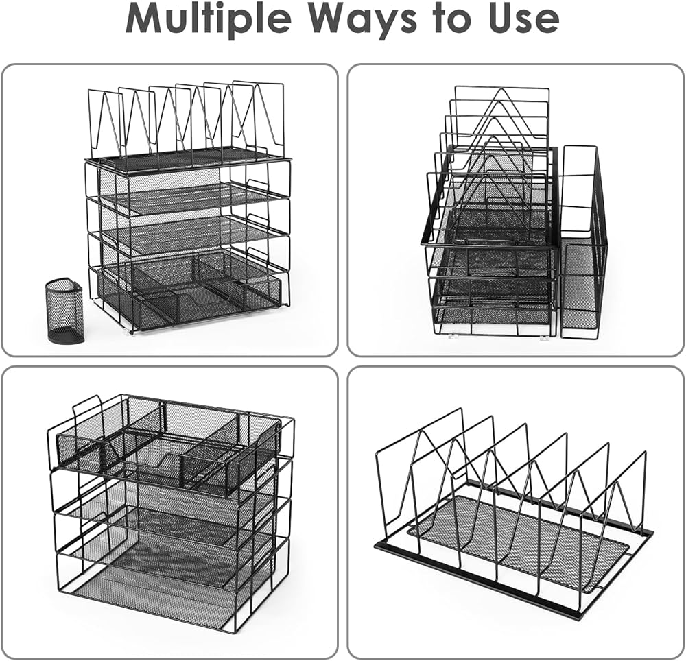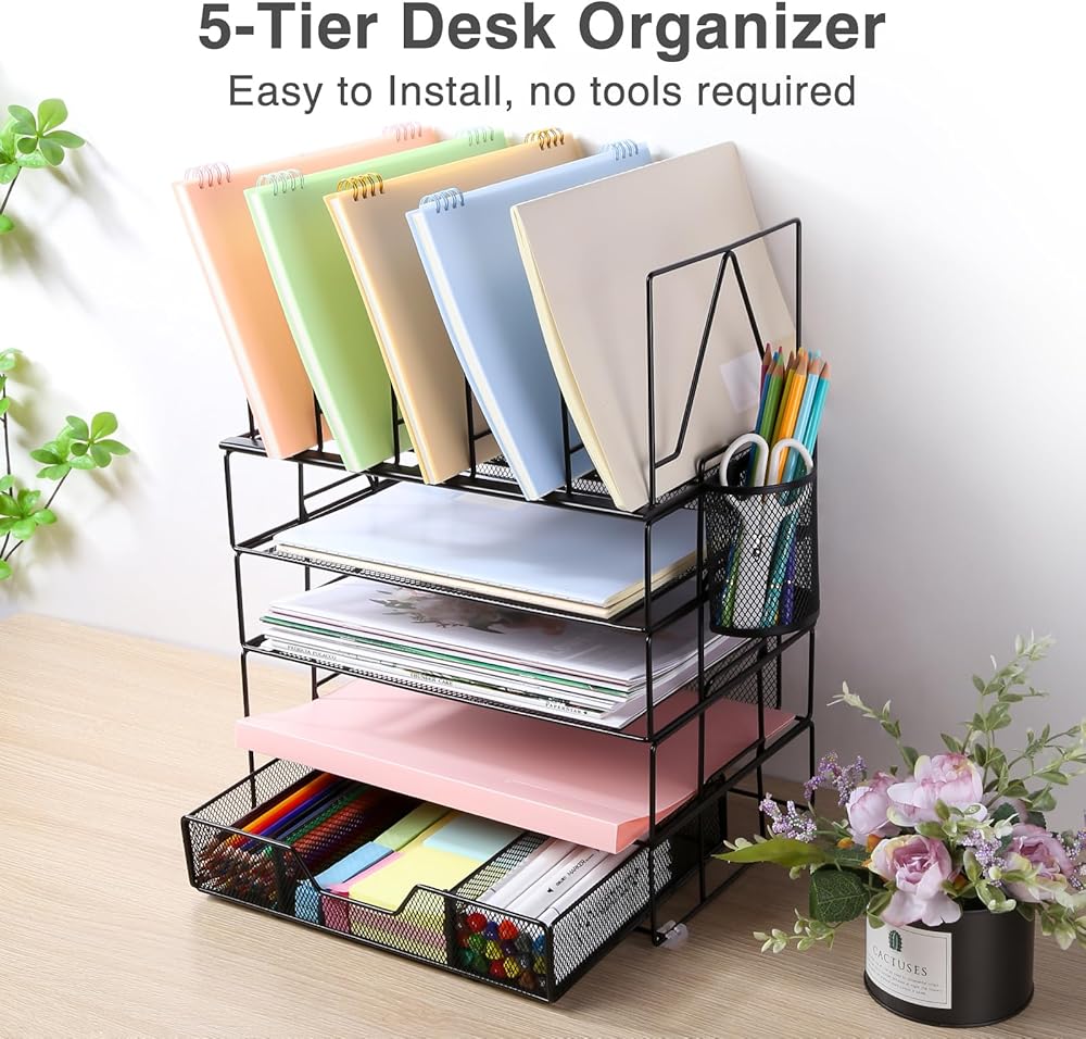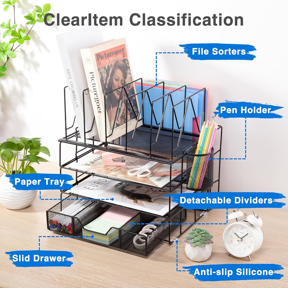 ✿ منظم مكتب من 5 طبقات✿ - تعرض منظمات وإكسسوارات المكتب المطورة القابلة للفصل ثلاث صواني وثلاثة فرز للملفات وحامل أقلام ودرج منزلق وأربع وسادات سيليكون غير قابلة للانزلاق. يضمن هذا الترتيب المحدد جيدًا للعناصر الوصول بسهولة إلى اللوازم المكتبية.
