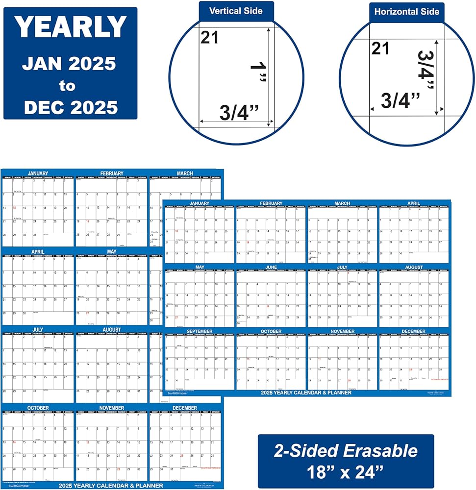 تقويم حائط SwiftGlimpse 2025 مقاس 45.72 سم × 60.96 سم، قابل للمسح، كبير رطب وجاف، مصفح، مخطط حائط سنوي سنوي لمدة 12 شهرًا، قابل للعكس، أفقي/عمودي، أزرق داكن