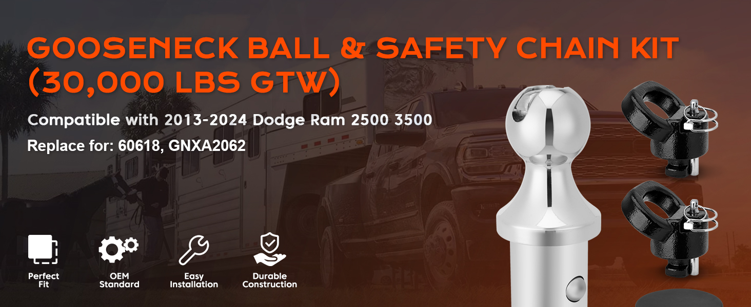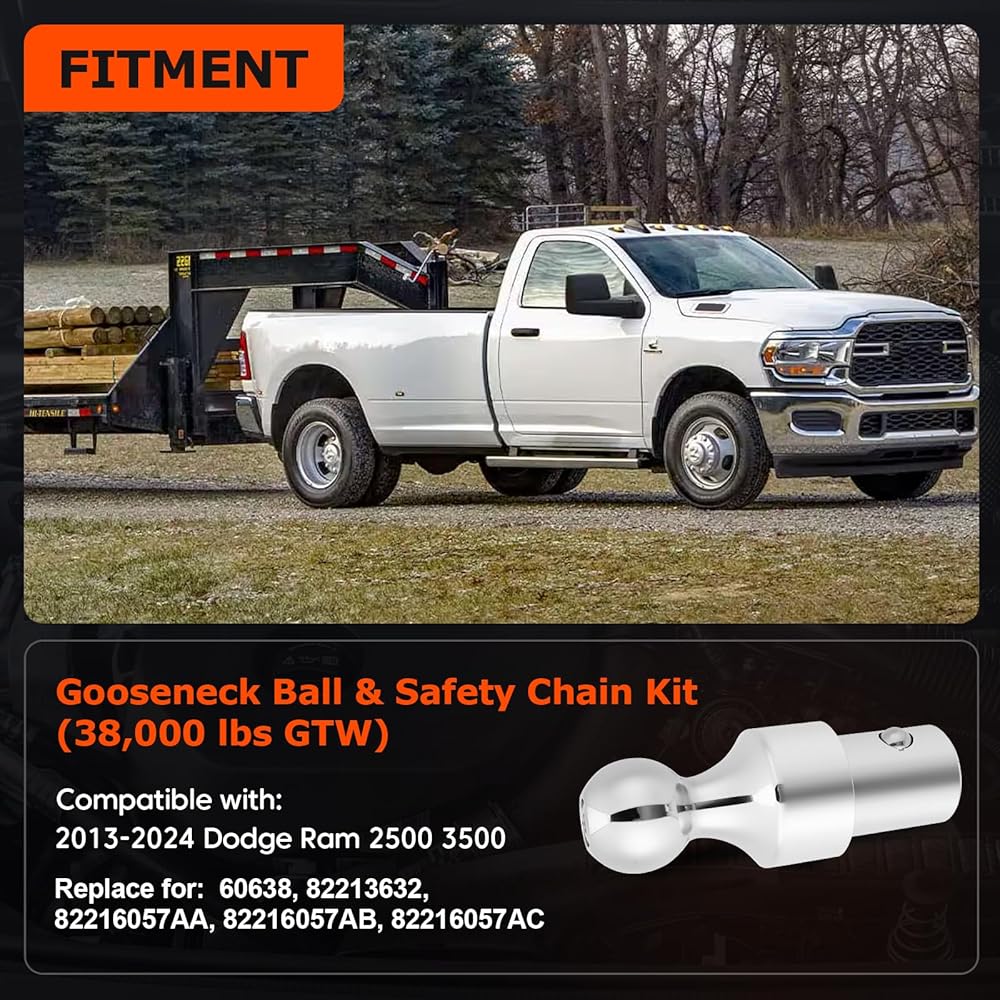 مجموعة كرات Gooseneck متوافقة مع 2013-2024 Dodge Ram 2500 3500، كرة 2-5/16 بوصة مع آلية قفل و2X استبدال مراسي سلسلة الأمان لـ 60638، 82213632، 82216057AB (بحد أقصى 38000 رطل. GTW)