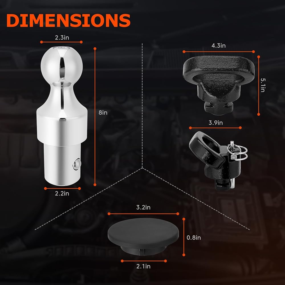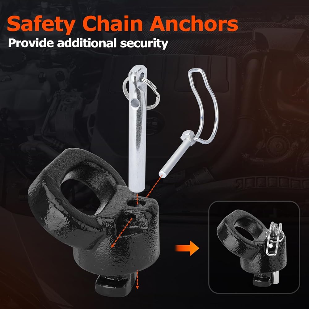 المجموعة الكاملة: تتضمن كل ما تحتاجه للتركيب: 1 × كرة ربط 2-5/16 بوصة، 2 × مرساة سلسلة أمان، 1 × قابس مطاطي، مما يوفر حلاً شاملاً لإعداد القطر الخاص بك