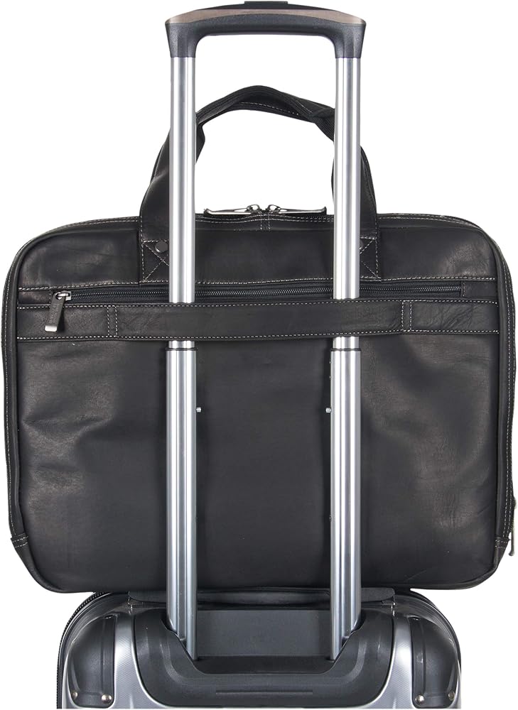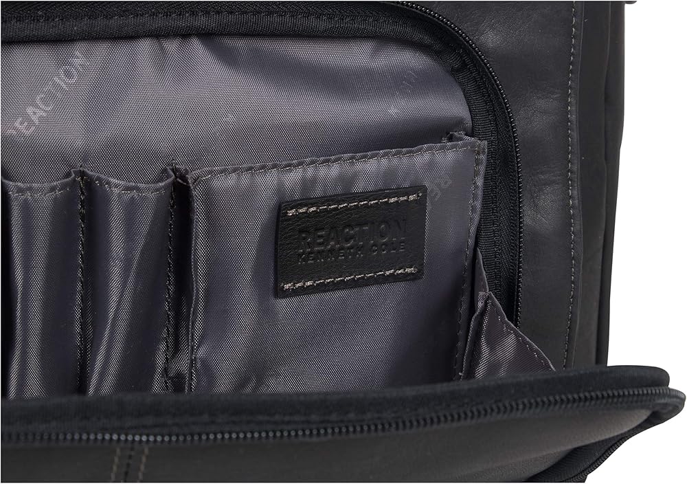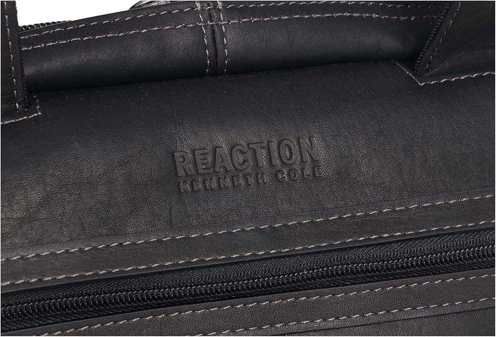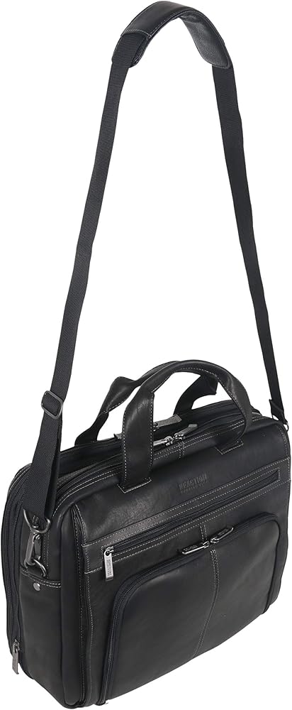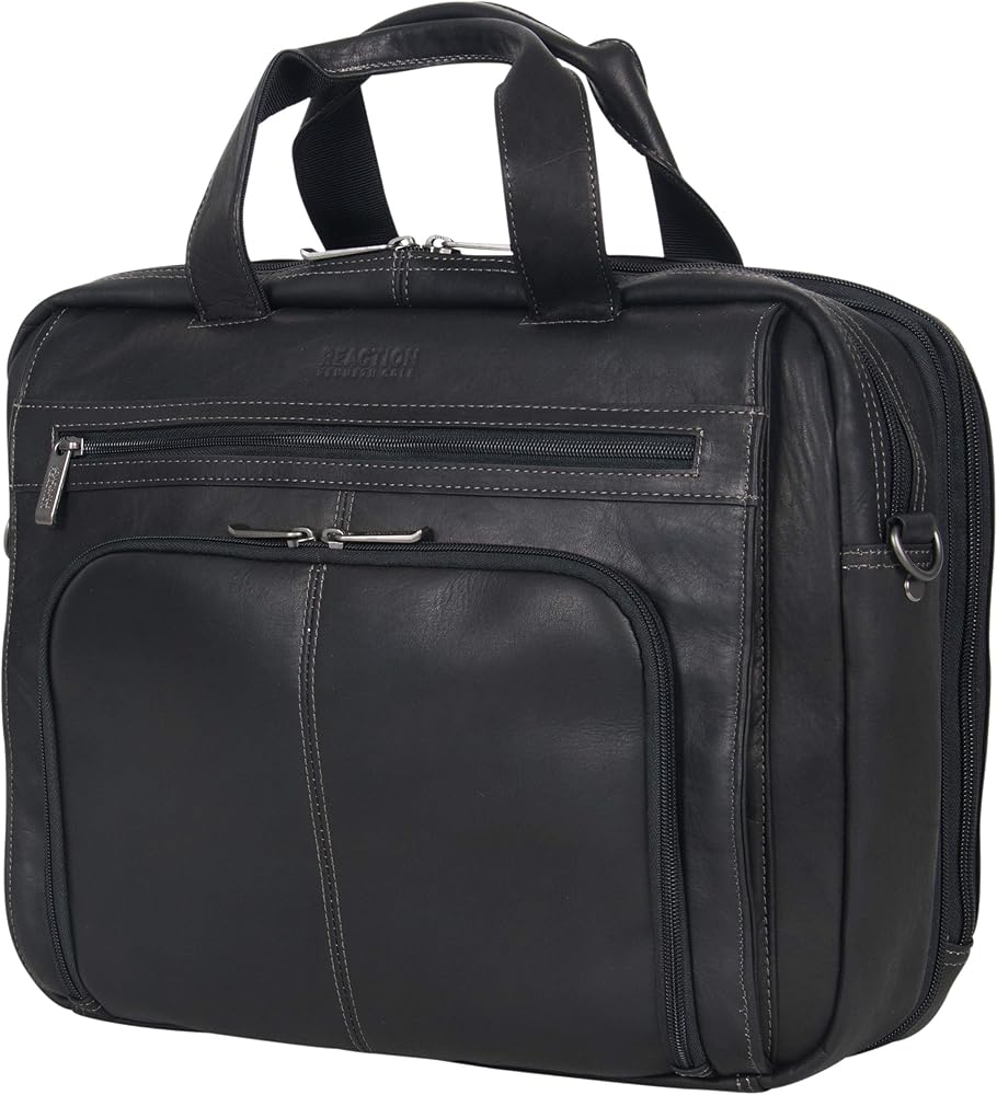 Take your essentials in classic style with Kenneth Cole Reaction ‘out of the bag' Colombian leather expandable 15.6” computer business portfolio. This feature-rich business bag boasts a padded laptop computer pocket and a fully lined double compartment construction that expands an additional 1.5 inches for greater carrying capacity when needed. Its front pocket organizer holds small business essentials like pens and pencils, business cards, and office supplies. The front compartment expands to hold the padded laptop compartment, three open padded pockets for accessories, and a rear file divider. Techni-cole RFID anti-theft radio frequency identification (RFID) Blocking technology line the organizer pockets with thin shielding fabric to help block radio waves from being transmitted from U.S. passports and certain credit/debit cards. Includes a removable padded shoulder strap that extends 52 inches, as well as a rear trolley strap to slide the briefcase over luggage trolley handles for hands-free carrying. This is the perfect feature-rich leather business case for professionals whom value both style and function. ★ Overall Size: 16.5” L x 12” H x 5” – 6.5” D. ★ Laptop Pocket Dimensions: 15.25” L x 11.5” H x 1.5” D. ★ Product Weight: 3.2 lbs. ★