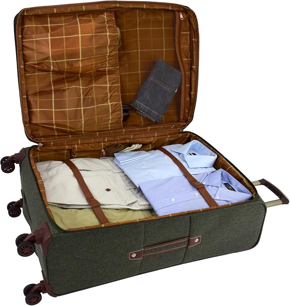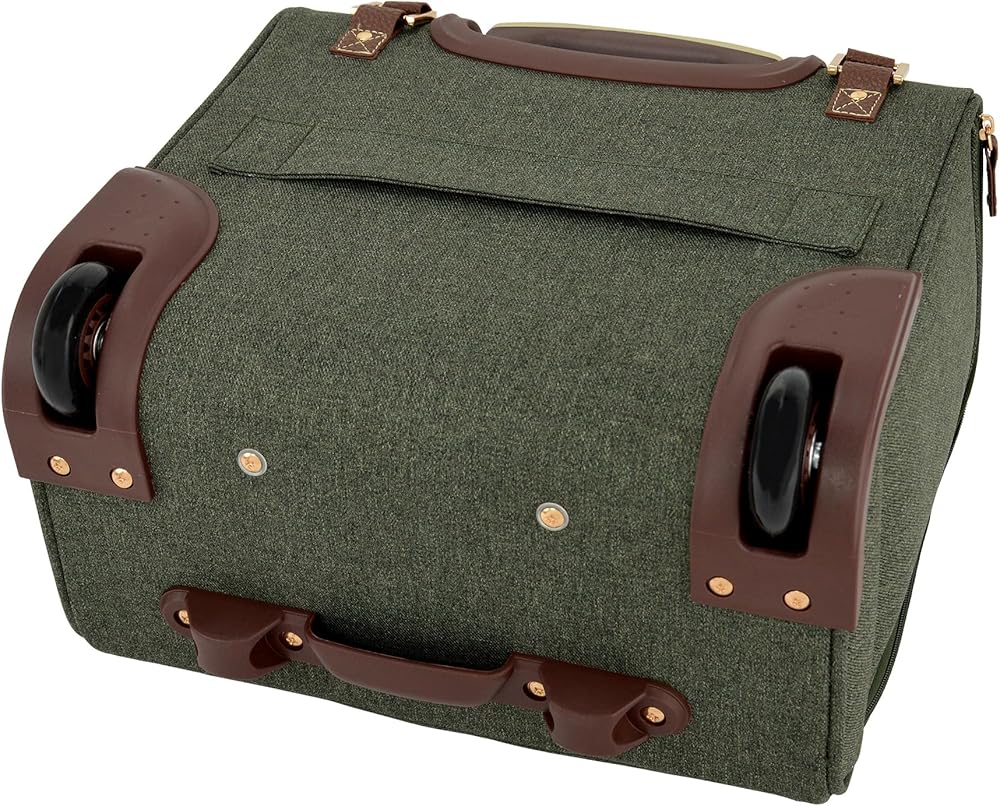 Low profile 360° multi-directional 8-wheels mounted to grid base for stability, Convenient top, side & bottom carry handles, Full London Fog plaid lining