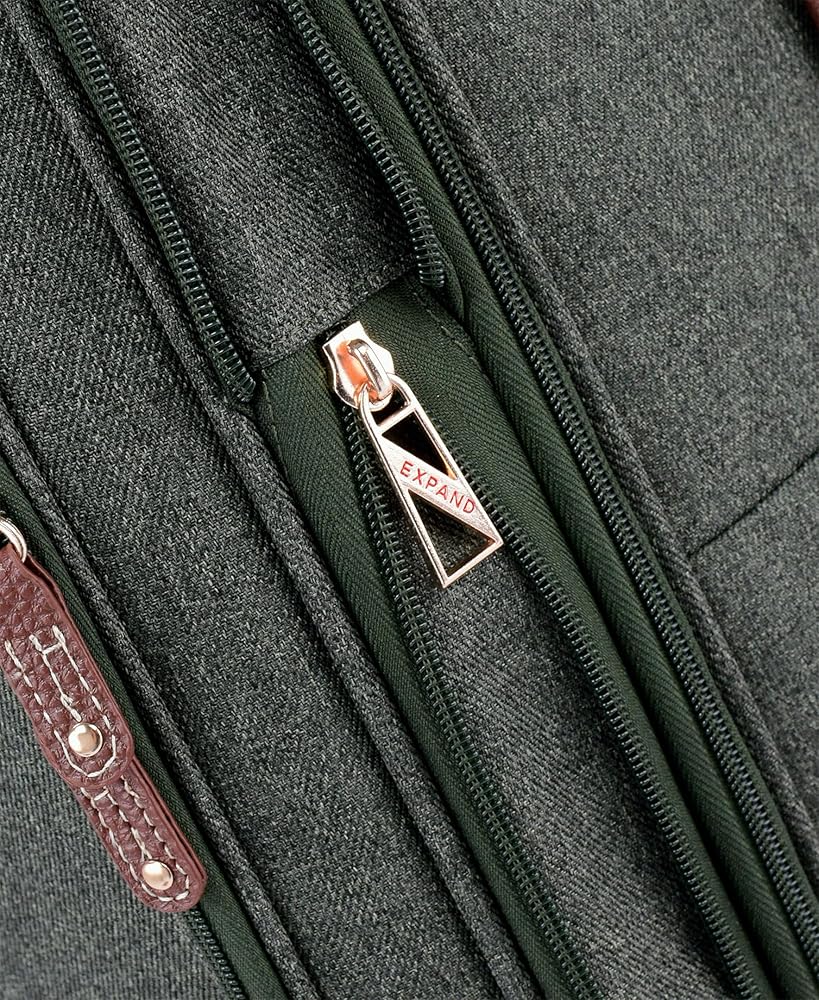 The 4-piece set consists of the 15" Under the Seat Bag, the 20” Expandable Carry-On Spinner, the 25" Expandable Spinner and the 29” Expandable Spinner. High density woven material with vegan leather trim
