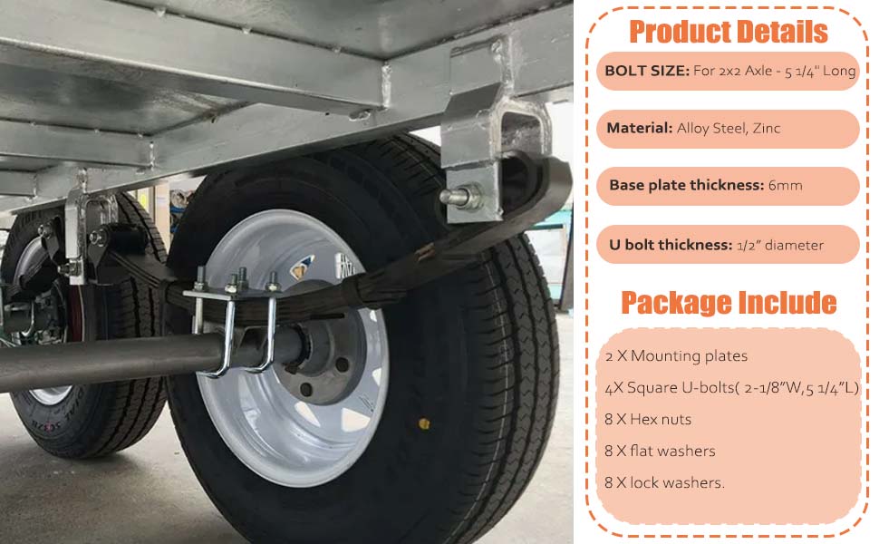 • المزيد من التطبيقات: البراغي المربعة على شكل حرف U مناسبة لمحاور مقطورة القوارب 2x2 ويمكن استخدامها في مجموعة واسعة من التطبيقات مثل القوارب والمقطورات والطوافات والمزيد. يمكن استخدامه أيضًا لتأمين أو توصيل أجزاء القفل على الأجسام الخشبية والمعدنية المستطيلة