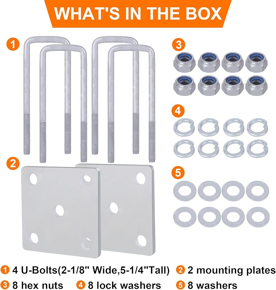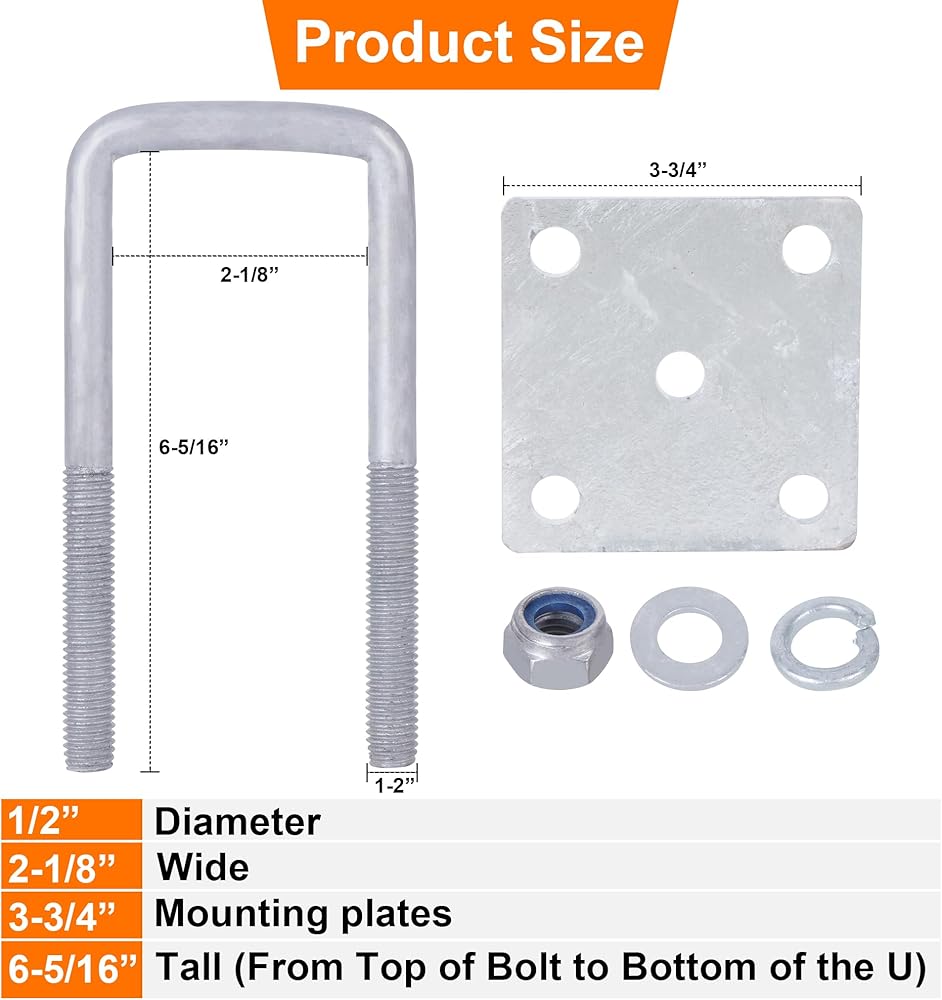 • تفاصيل مقاس U-Bolt: حجم مسمار U المربع الخاص بنا هو 1/2 بوصة عمق × 2-1/8 بوصة داخل العرض × 5 1/4 بوصة داخل الطول، هيكل فولاذي عالي التحمل بسمك 1/2 بوصة لتحقيق أقصى قدر من المتانة