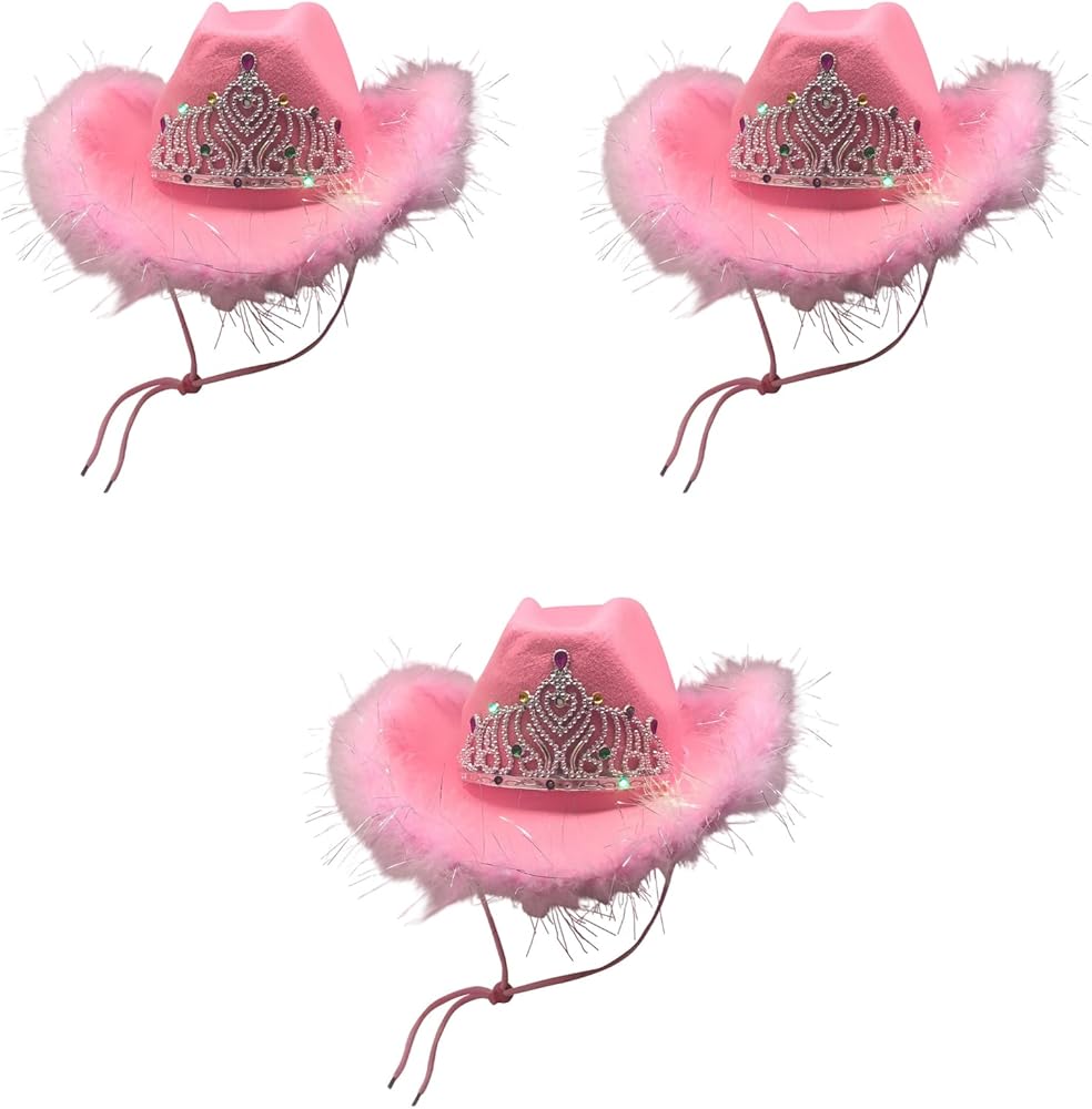 • These cute cowgirl hats feature a sparking blinking tiara design on the front with bright flashing LED lights. You will love how they sparkle and shine with their new pink cowgirl hat. The lights can be used repeatedly and will last for a long time. (Batteries Included)