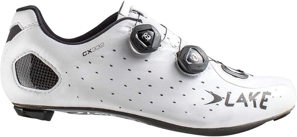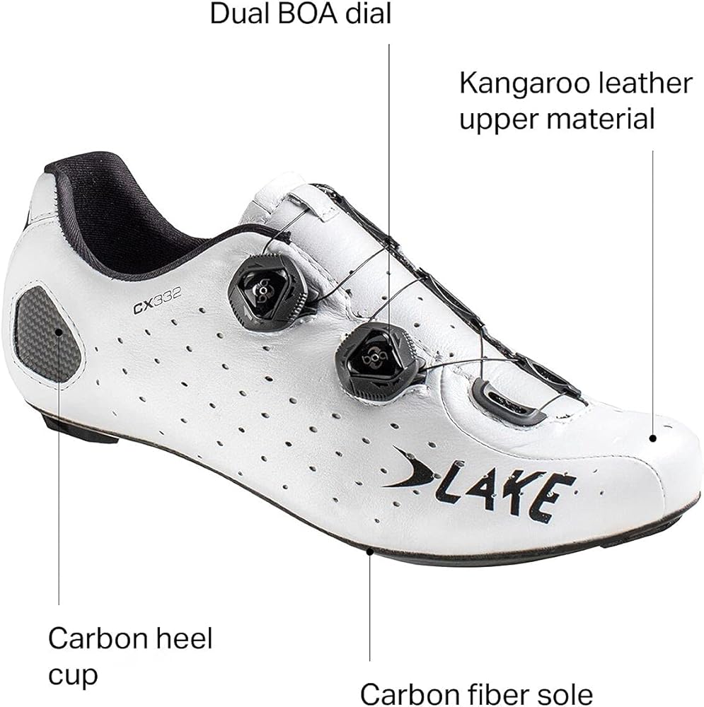 As you're tracking the race-winning line through the narrowing chicane, maddeningly shifting the gears to find optimal power and acceleration to weave between pinching riders, you need your shoes to be dialed and just as capable as your performance demands. And the Lake CX332 road-cycling shoe is a performance-minded racing companion that is also highly comfortable for longer training days. A Dual 80K Force carbon sole offers a high stiffness-to-weight ratio that sacrifices little to the top-tier CX403. A semi-flexible fiber glass insole works to reduce hot-spots and swelling that sap power and desire as training-miles progress. Performance extends to the heel cup where molded carbon, receiving Thermaform treatment, offers a custom fit to control heel-slip during high-tension situations. The Boa dials offer one-handed, incremental adjustments, and the Klite Kangaroo leather upper and perforated lining offer a natural material for durability and performance.