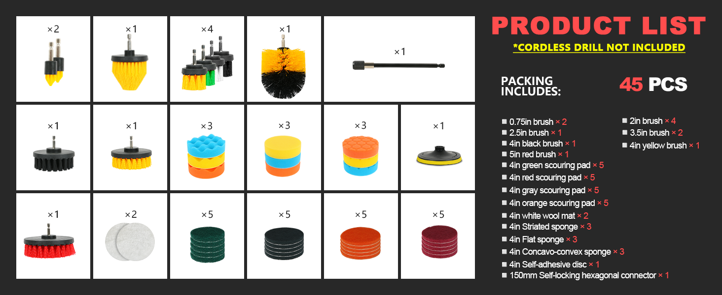 حل التنظيف الشامل - مجموعة ملحقات فرشاة الحفر المكونة من 45 قطعة هي الخيار الأمثل للحصول على تجربة تنظيف شاملة وسهلة. تتضمن مجموعة متنوعة من أشكال الفرشاة وصلابتها، ووسادات التنظيف، ووسادات التلميع الإسفنجية، ووسادة عازلة من الصوف، بالإضافة إلى ملحق طويل المدى. (المثقاب غير متضمن).