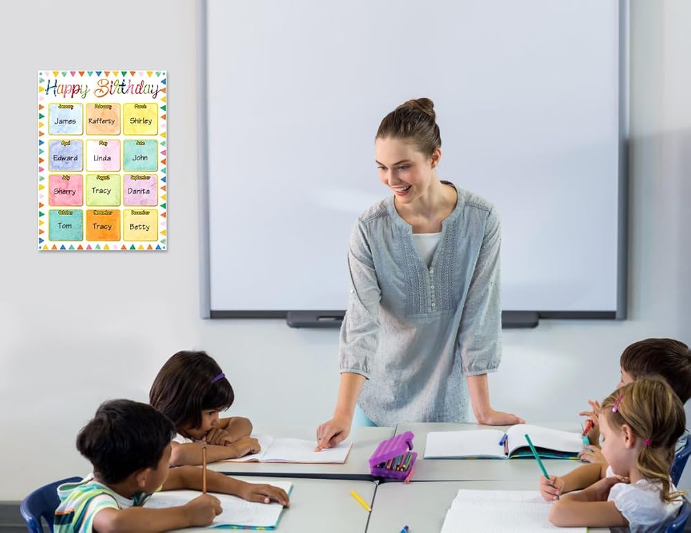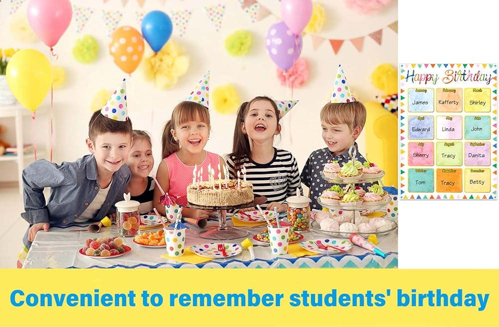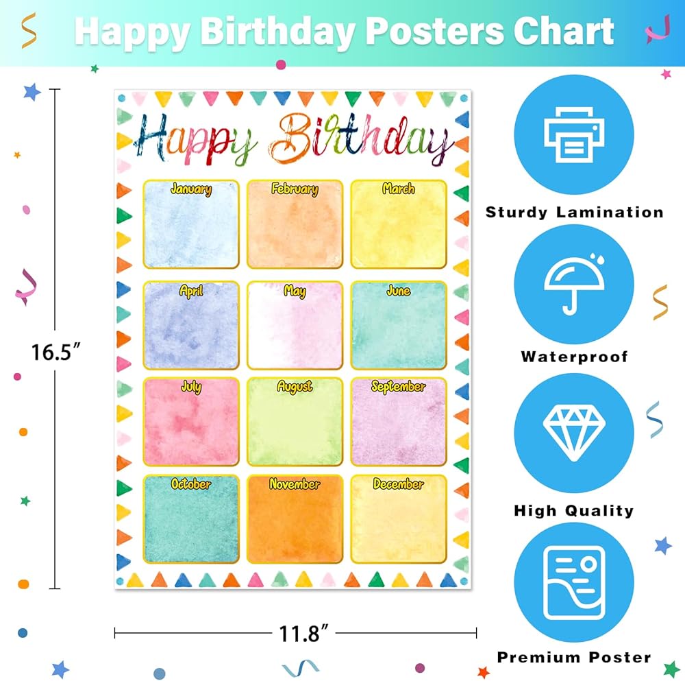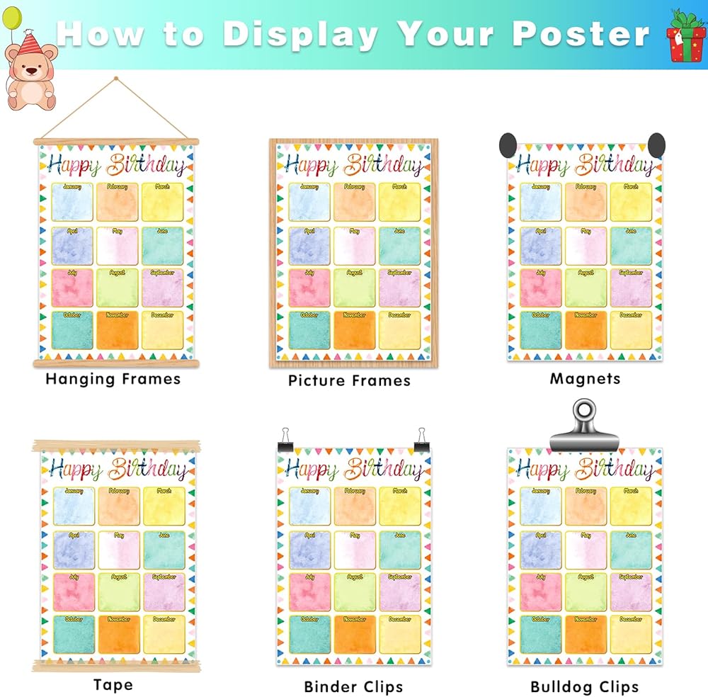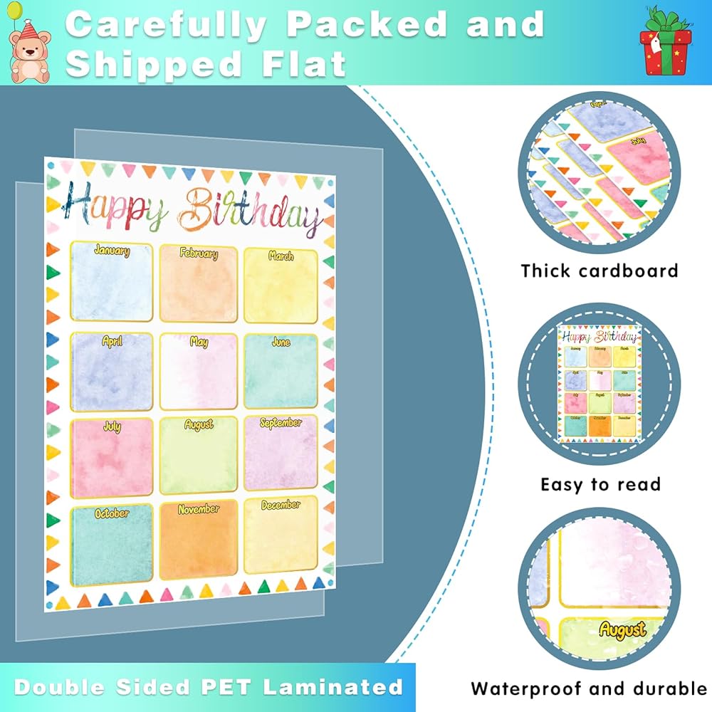 • ألوان وأنماط مبهجة: تم تصميم مخططات ملصقات تقويم عيد ميلاد سعيد بألوان جذابة جميلة وعناصر رسومية، تجذب انتباه أطفالك وستثير الصور النابضة بالحياة فضولهم، إضافة رائعة إلى الفصول الدراسية الابتدائية والمتوسطة، وعرض ملصق عيد الميلاد على الفصل الدراسي لوحة إعلانات لتدوين أعياد ميلاد الطلاب لكل شهر.