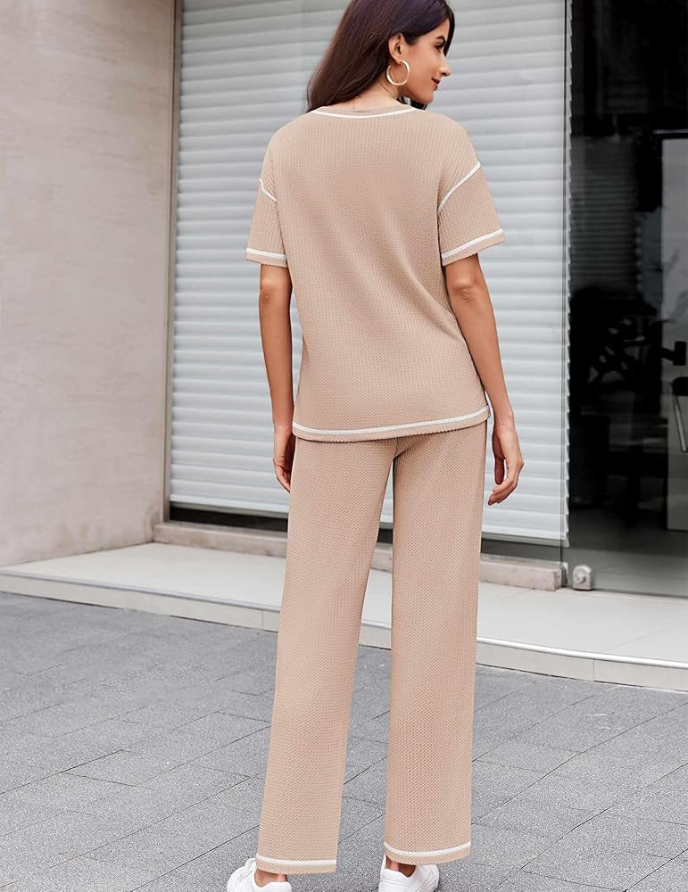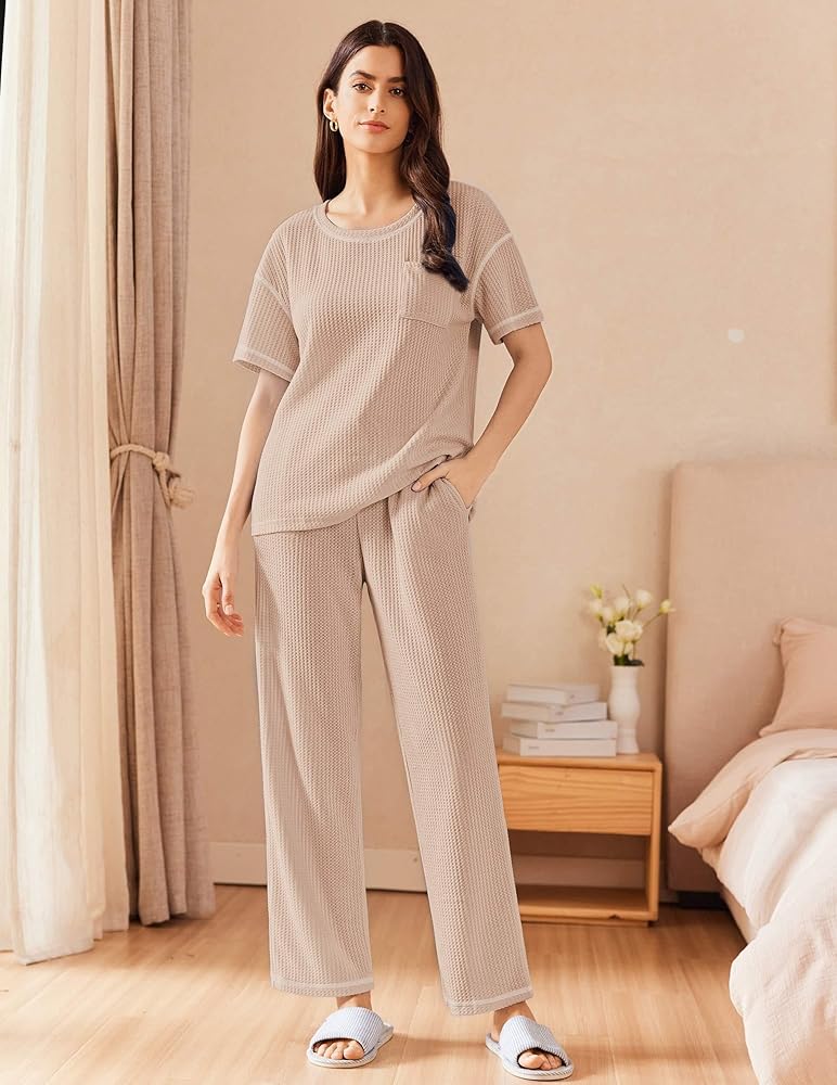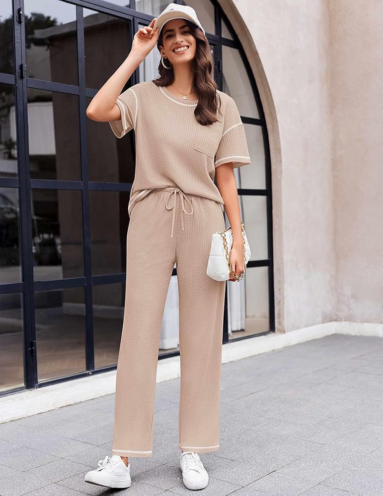 بيجامة وافل علوية: مجموعة ملابس الاسترخاء النسائية الكاجوال تحتوي على بلوفر علوي. هذه السترة العلوية ذات الأكمام القصيرة مليئة بالمرونة، ومناسبة لجميع أشكال الجسم. يمكن ارتداؤه بسهولة مع الجينز والسراويل الضيقة والسراويل القصيرة والأحذية العالية.