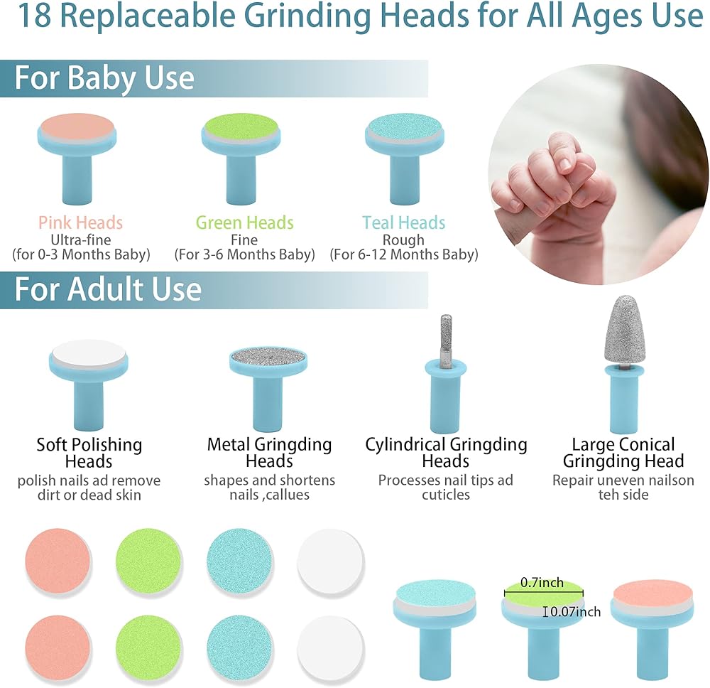 مجموعة العناية بالأظافر 18 في 1 - تختلف عن مبرد الأظافر الكهربائي للأطفال في السوق، يأتي مبرد الأظافر الكهربائي للأطفال الخاص بنا مع 10 رؤوس جلخ، و8 أوراق صنفرة مبطنة عالية الجودة مصممة لمراحل مختلفة من نمو الطفل والاحتياجات المختلفة.