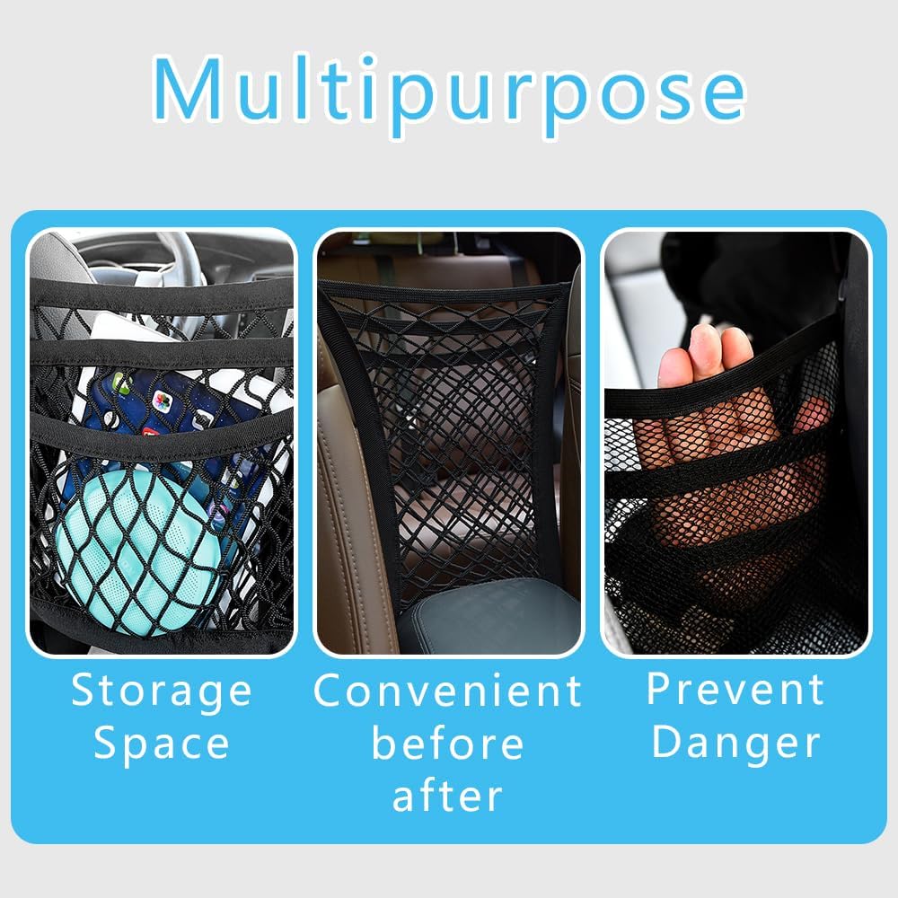 [Versatile]: It's More than just a Car organizer, the 3 Layer Four-Side Elasticity Car Purse Net can hold your small handbag, wallet, cell phone, tissues, documents and more. Still back seat with pet and child barriers.