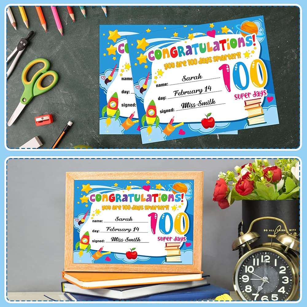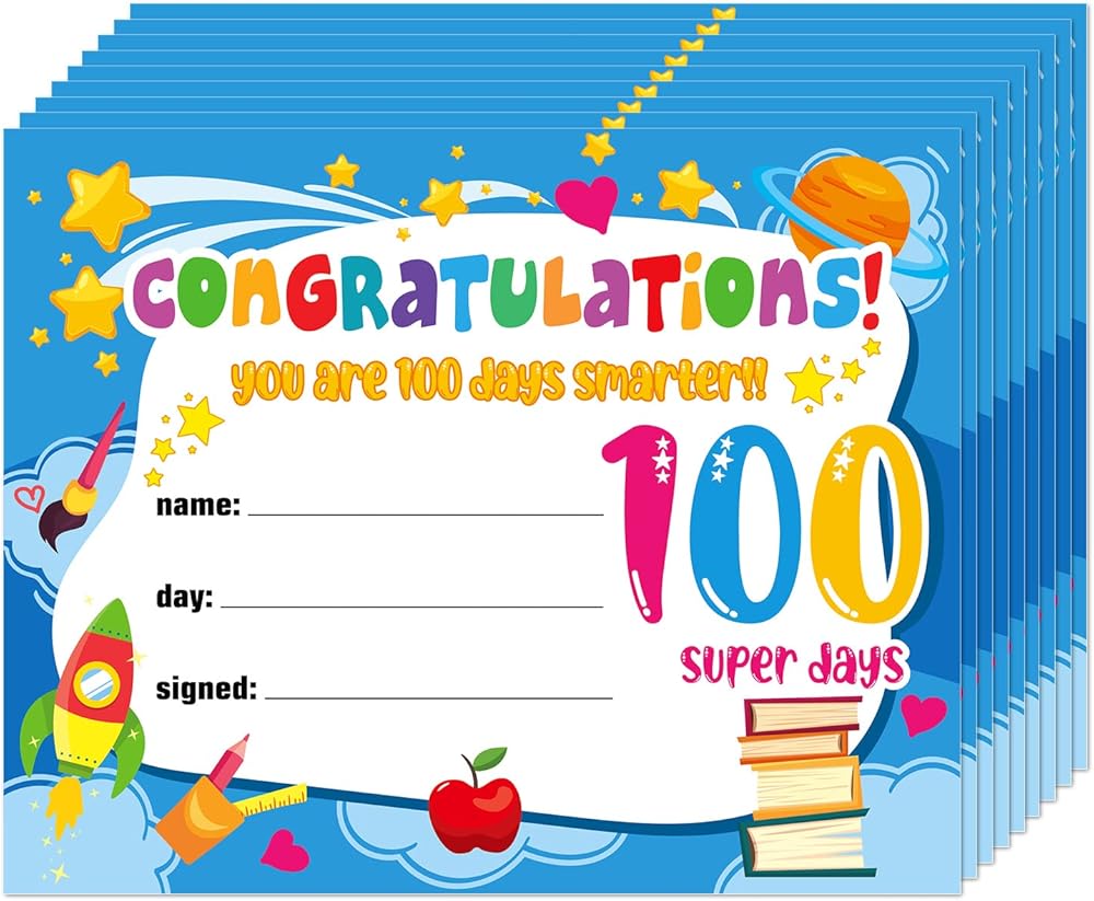 【100 Days Classroom Activities Certificate for Kids Student】: 100 days of school awards certificate is designed with classic festival elements and embellished with stars,heart,book,rocket,paintbrush, pencil and planet,and an artistic "CONGRATULATIONS! you are 100 days smarter! 100 super days" message,interesting and unique recognition awards that student and kids will love them,a great way for teachers to recognize their students' 100 days of school.