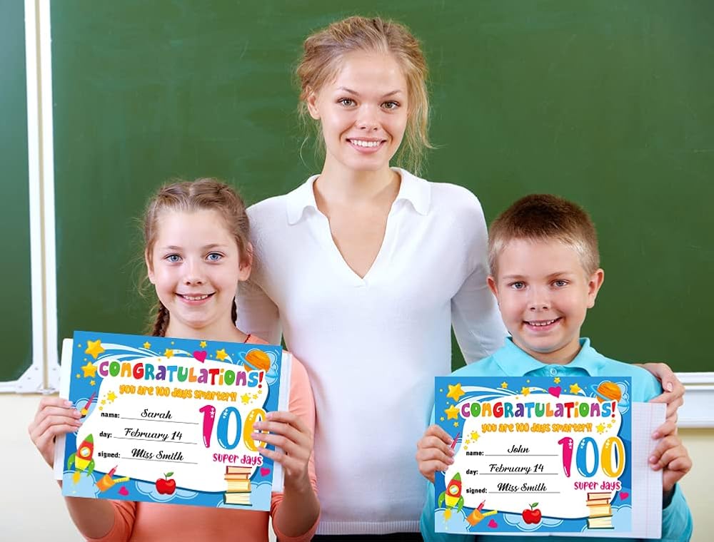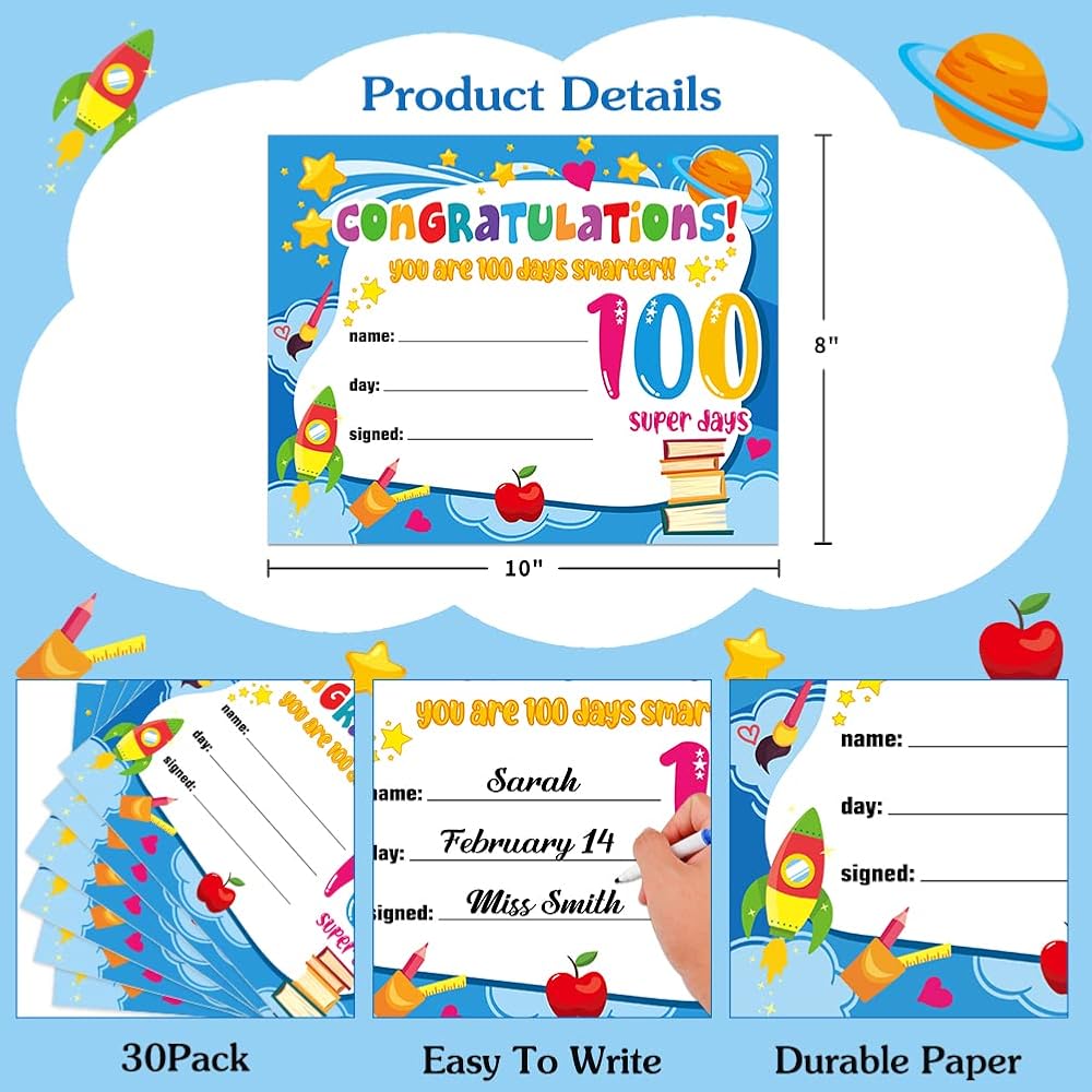 【100th Day of School Award Certificates】: Package includes 30 pieces of 100th day of school awards certificates,sufficient quantity for you to celebrate student achievements at kindergarten preschool primary high school classroom party,create a happy and unforgettable atmosphere for the 100 days of school party.