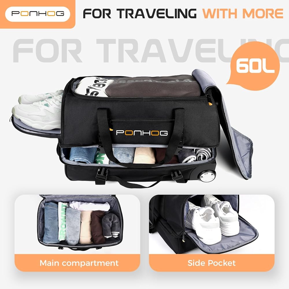 حقيبة دفل بعجلات - حقائب دفل كبيرة بعجلات سعة 60 لتر للسفر مقاومة للماء مع حجرة للأحذية للسفر وصالة الألعاب الرياضية طوال الليل وعطلة نهاية الأسبوع باللون الأسود
