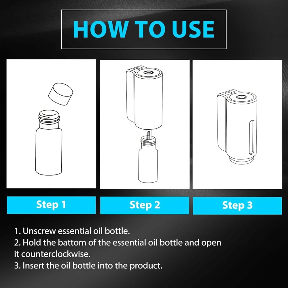 سهلة التركيب: 1. افتح زجاجة الزيت العطري وأدخل المصاصة في زجاجة الزيت العطري. 2. أدخل زجاجة الزيت العطري من الأسفل وشدها في اتجاه عقارب الساعة. 3. أخيرًا، اضغط مع الاستمرار على المفتاح لتشغيل الطاقة، واضبط الوضع المطلوب، ثم استخدم مشبك الهواء العالمي الموجود على المنتج لتثبيته بمخرج الهواء لمكيف الهواء.