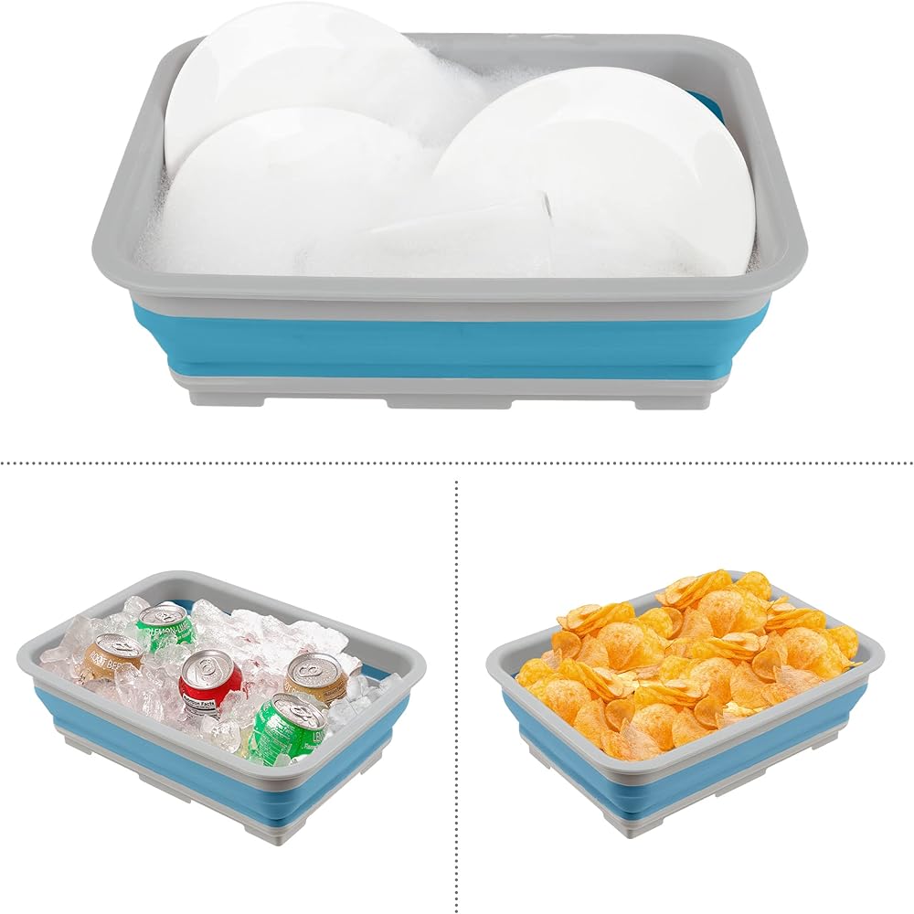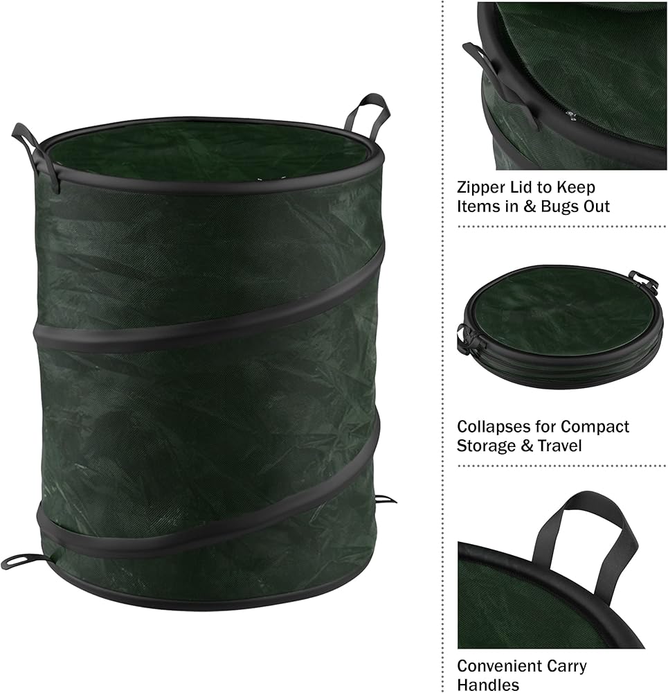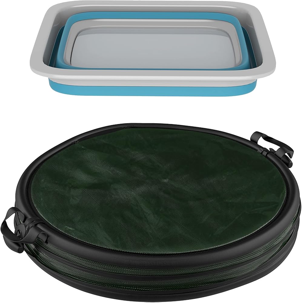 • SMART DESIGN – These pop-up camping or RV accessories have a space-saving collapsible design that allows the tub to fold to a compact 2-inches and the trash bin to 2.5-inches. The garbage container also has a zippered lid to help deter critters or wind.