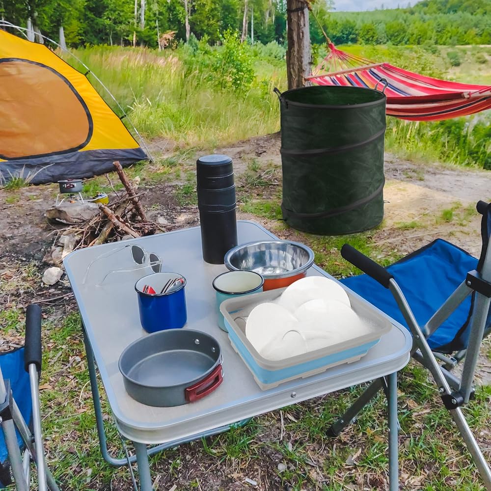 • POP UP TRASH CAN AND PLASTIC TUB SET – These camping essentials are great for a variety of tasks at home and on the go. Use the dish tub as an ice bucket, camp sink, or for car washes, and the large bin for garbage, yardwork, as a laundry bag, and more.