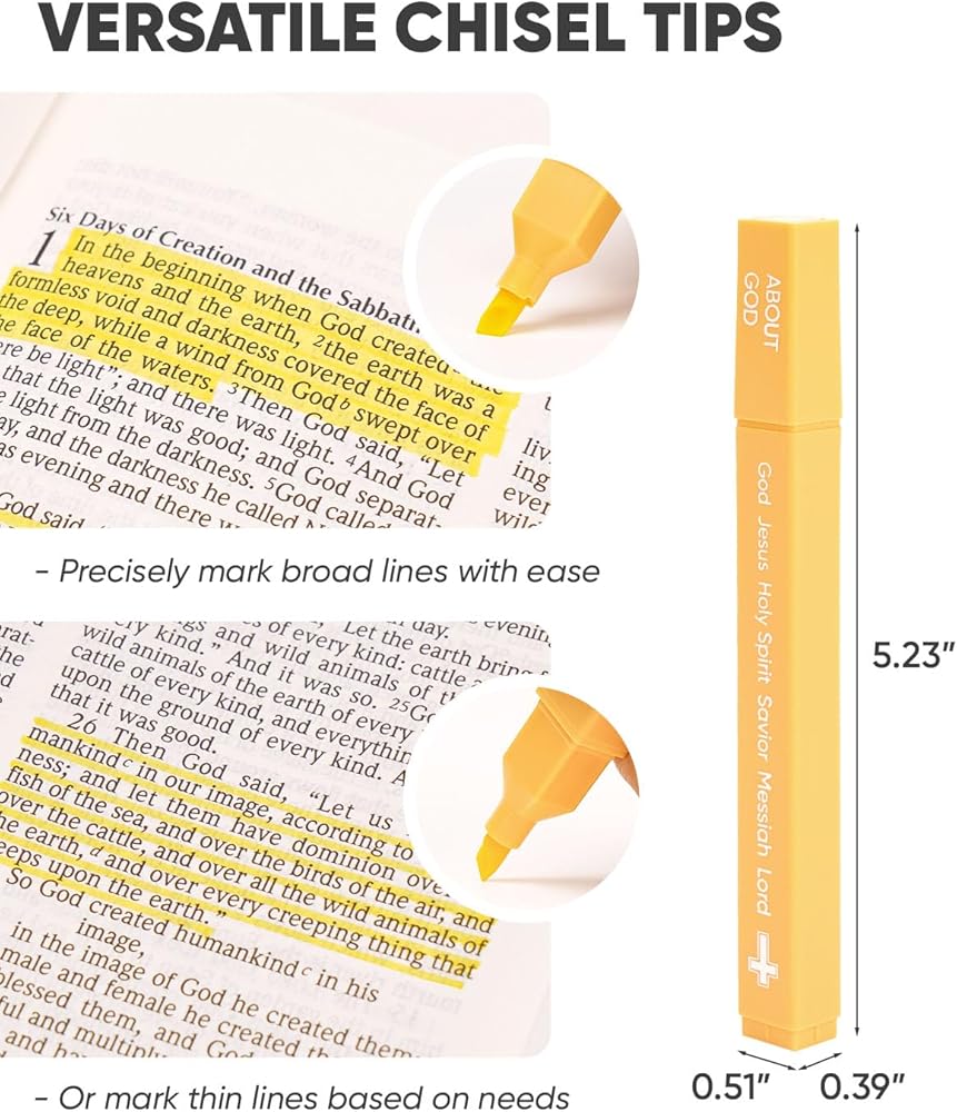 نصائح إزميل متعددة الاستخدامات: تسمح لك أقلام التحديد ذات الطرف الإزميل للكتاب المقدس بالتظليل بدقة وتحكم أكبر في كل من الضربات العريضة والضيقة، مما يمنحك المرونة في التظليل بتركيزات مختلفة.