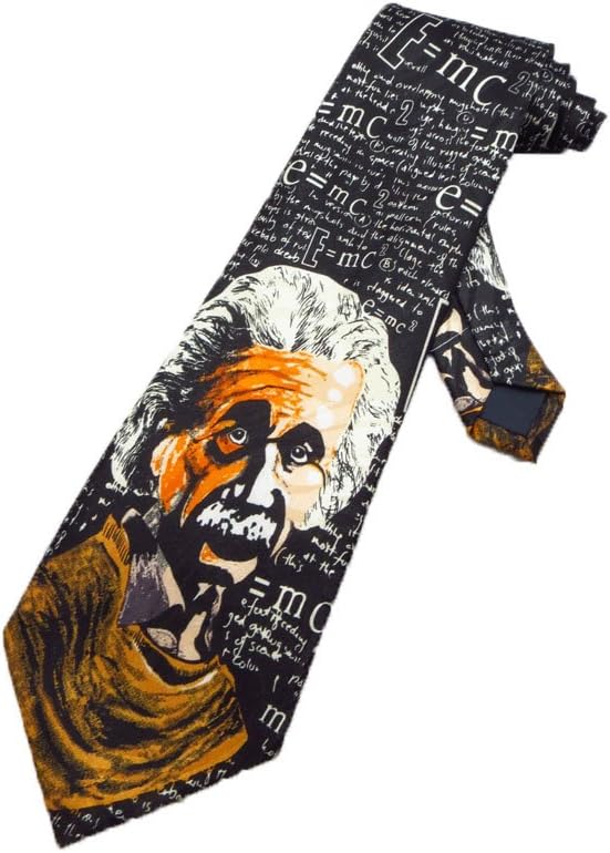 The tie has a portrait of Albert Einstein, the great scientist, and pattern of science notes and equations all on a black background