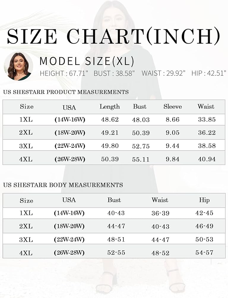 المقاس: XL (US14-16)، 2XL (US18-20)، 3XL (US22-24)، 4XL (US26-28). يُغسل في الغسالة بماء خفيف أو بارد، ويُعلق أو يُجفف، ولا تستخدم المبيضات. يرجى الرجوع إلى جدول المقاسات قبل الطلب