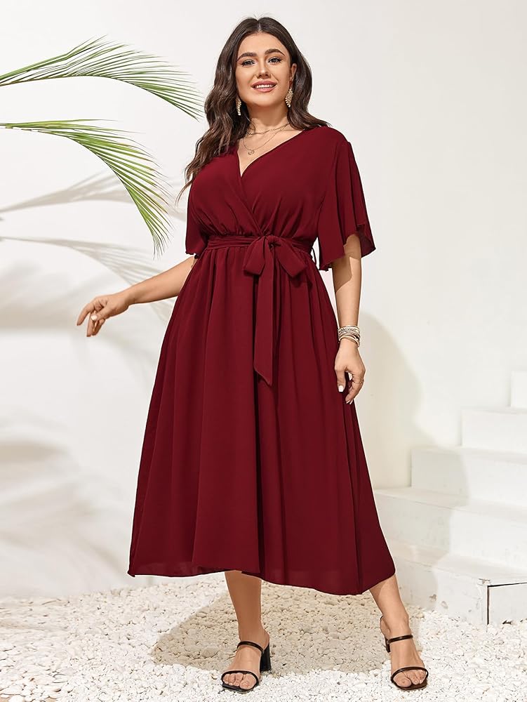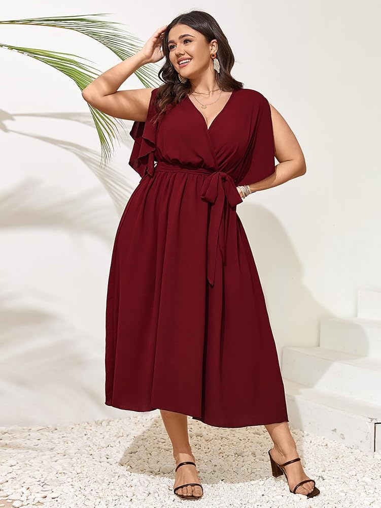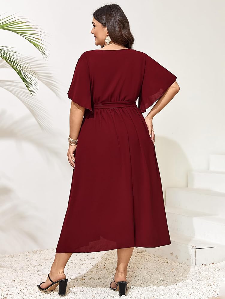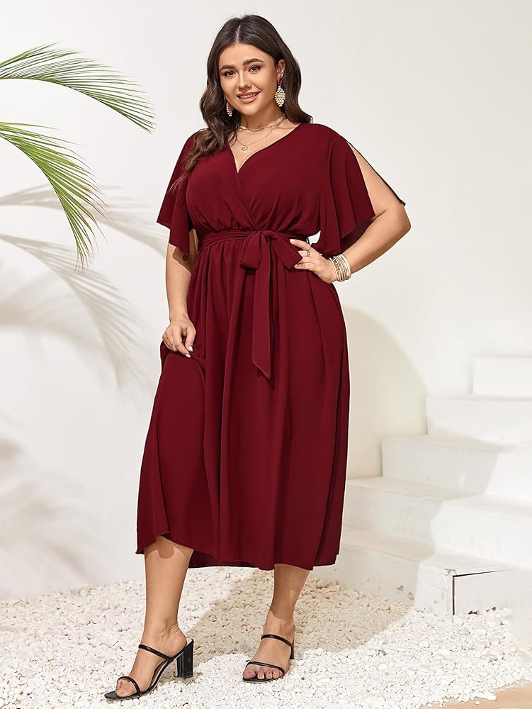 المميزات: فستان طويل للنساء يتميز برقبة ملفوفة مثيرة على شكل حرف V، وأكمام قصيرة، مقاس مريح، وأكمام مقسمة، وخصر عالٍ، فستان ملفوف، فستان طويل سادة، حزام ملفوف عند الخصر