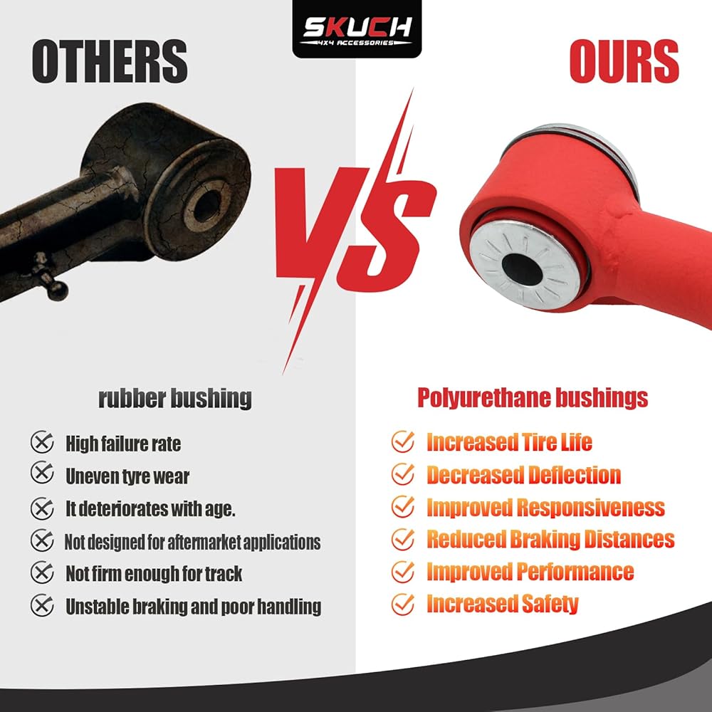 • البطانات المصنوعة من البولي يوريثين الممتازة: تتميز البطانات المصنوعة من مادة البولي يوريثين (PU) عالية الأداء، وتوفر أذرع التحكم هذه مقاومة فائقة للتآكل مقارنة بالبطانات المطاطية التقليدية. توفر البطانات المصنوعة من البولي يوريثان معالجة أفضل وتجربة قيادة أكثر استجابة، مما يضمن بقاء تعليق سيارتك محكمًا ومتحكمًا فيه.