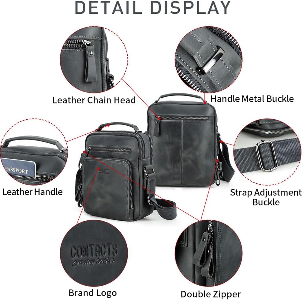 1.Men leather classic crossbody bag. It's quite handy for daily use and holiday. Man bag can hold your necessities for every day use. 2.Easy to carry when go out. Soft leather grey messenger shoulder Bag is durable and fashionable, suitable for work,shopping, outdoor, casual or formal carry. It can hold all of your necessities for your every day use, wallet, phone, passport, sunglasses, credit card, earphones, keys, etcs 3.Crazy horse leather is actually full grain cowhide leather. The surface is prone to scratches when rubbed against objects, but the marks will become lighter when rubbed with fingers. And over time, it tends to get more glamorous. Feature: Material: Top-layer cowhide leather Weight: 750g Style: Classic retro casual style Package included: 1 x Leather Men Messenger Crossbody Bag