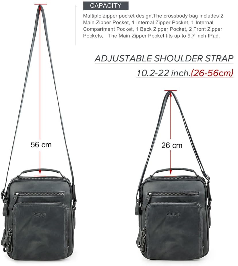 Dimension - 8.5 x 10 x 3.9 inches, the compact size yet multi-compartment design of mens travel leather bag provides plenty of room for essentials like ipad, document, wallet and other items, making it perfect for the office, out shopping or business trip, traveling
