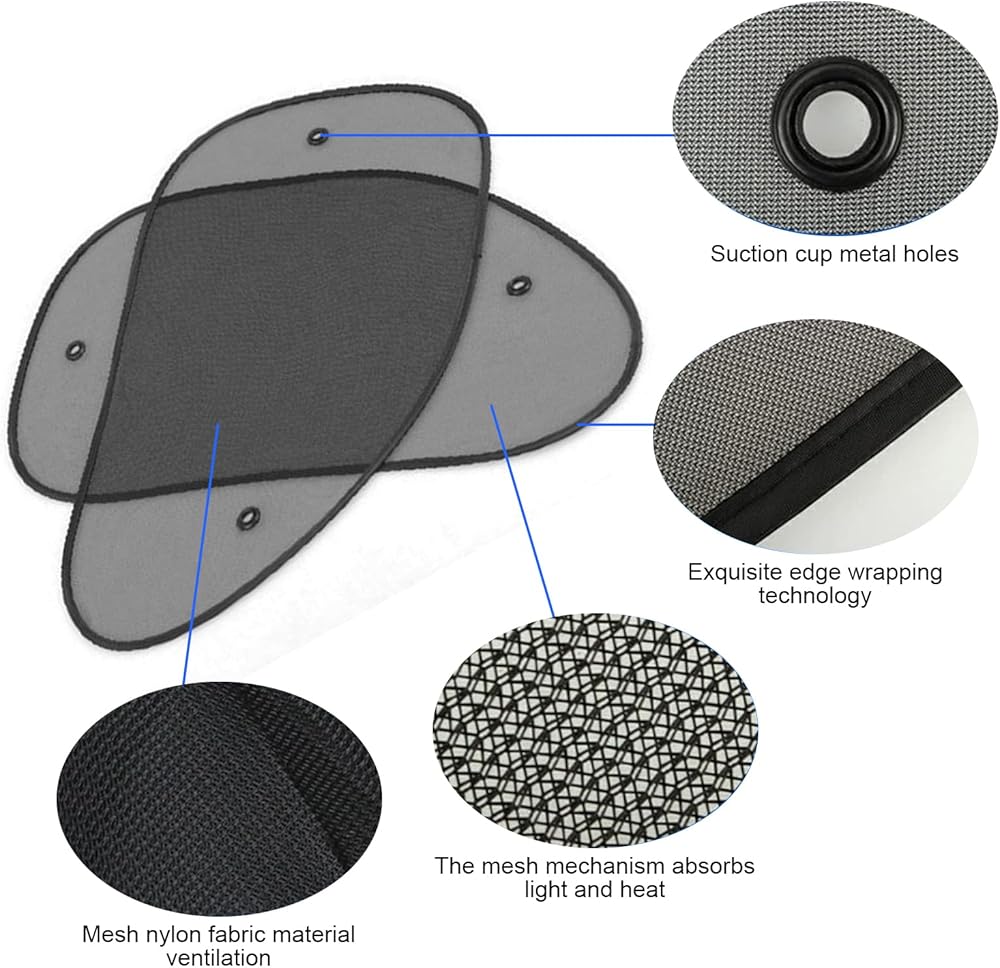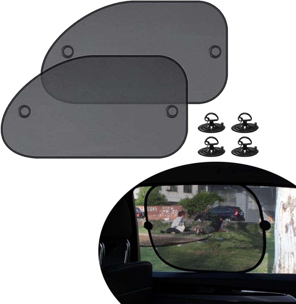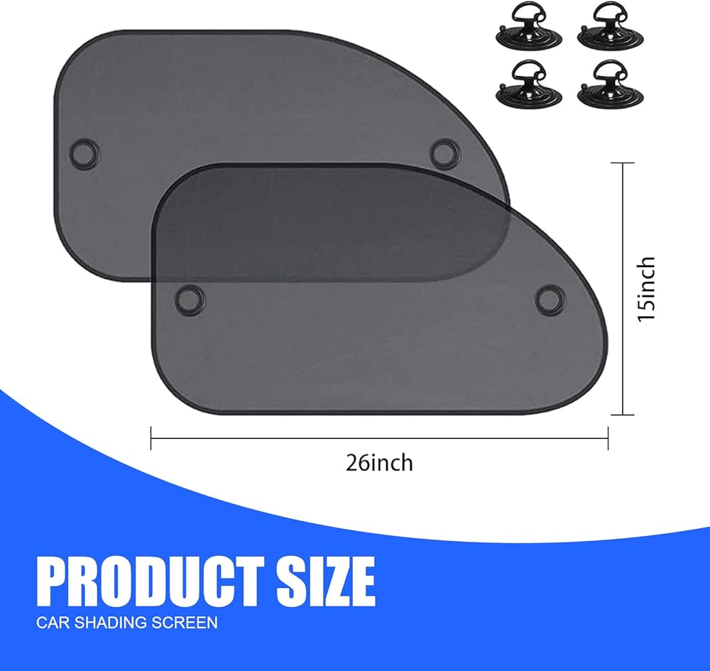 Product Specifications: The size of this car side glass shade is 25.59In x 14.96In, which can be perfectly fixed on the side window. After purchase, you will receive 2 x car side glass shades and 4 x suction cups for easy direct installation and fixation.