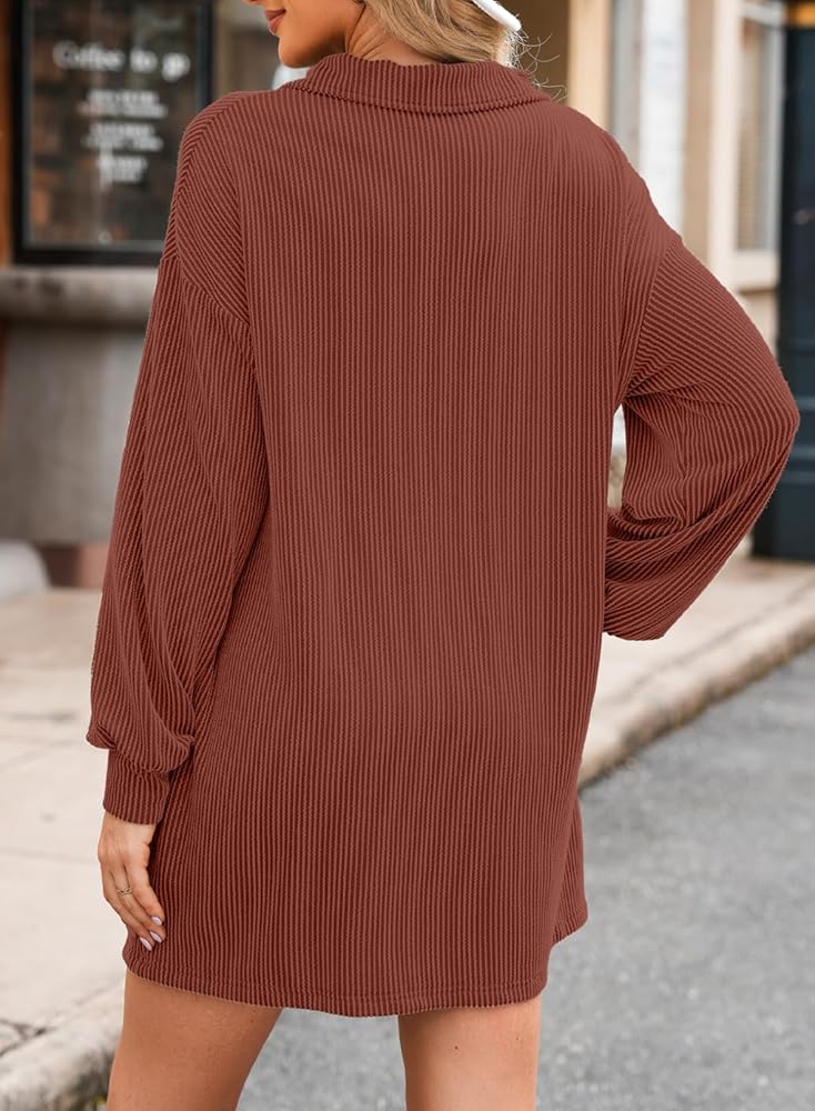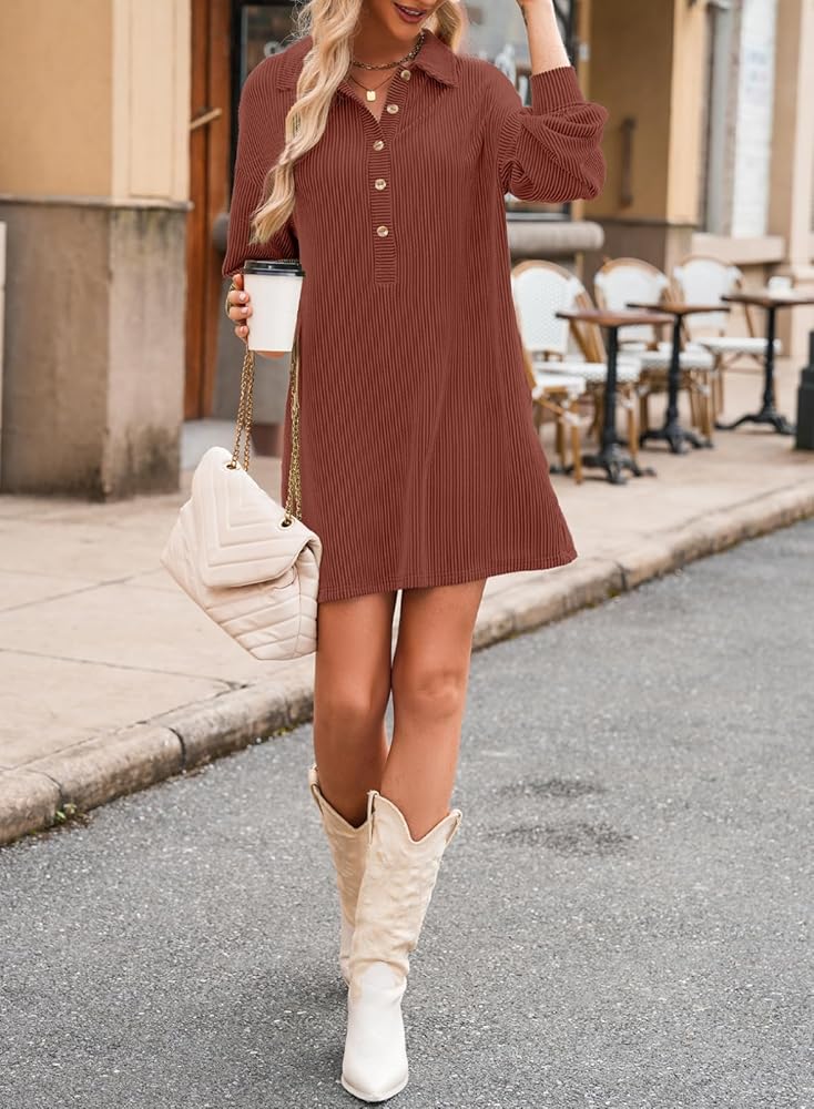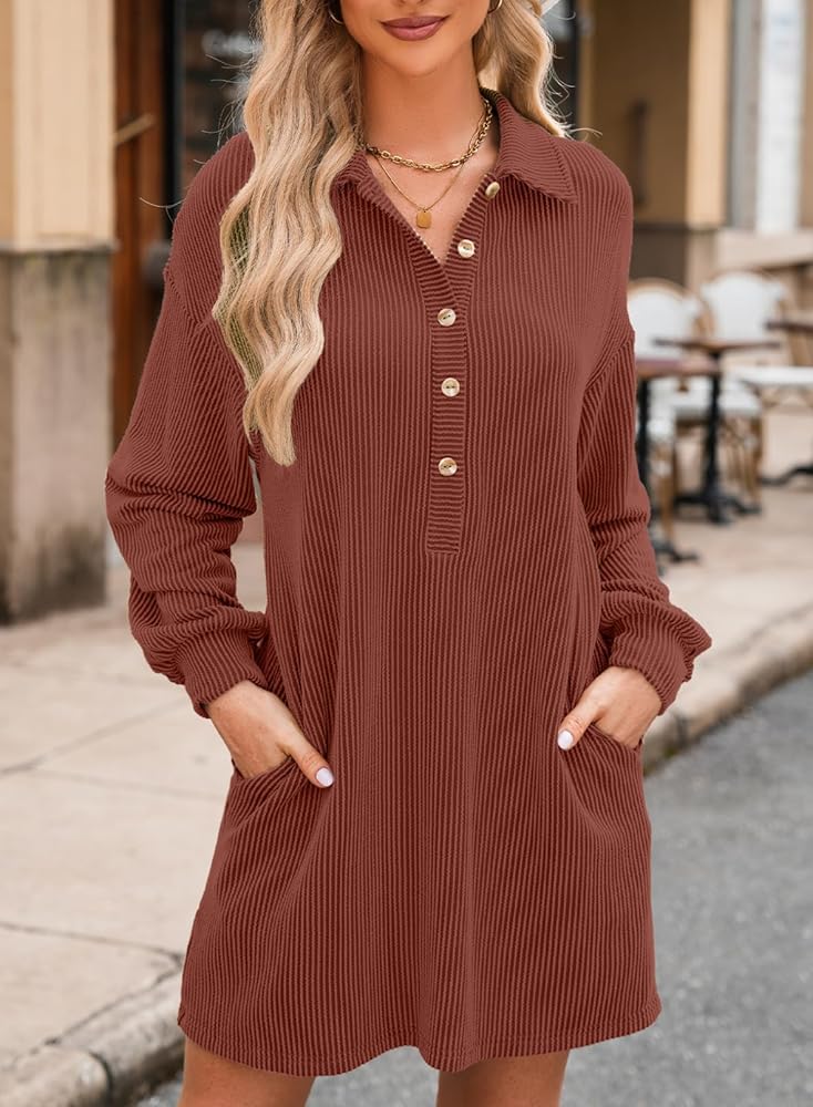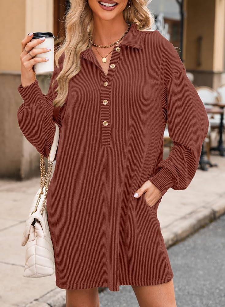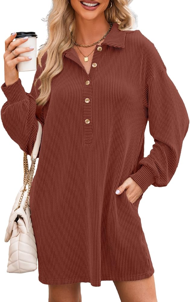 تصميم فريد: كم فانوس طويل، زر أمامي للإغلاق، جيبان جانبيان مخفيان، ياقة على شكل حرف V. فساتين بولو فضفاضة وبسيطة وواسعة لمظهر كاجوال وأنيق.