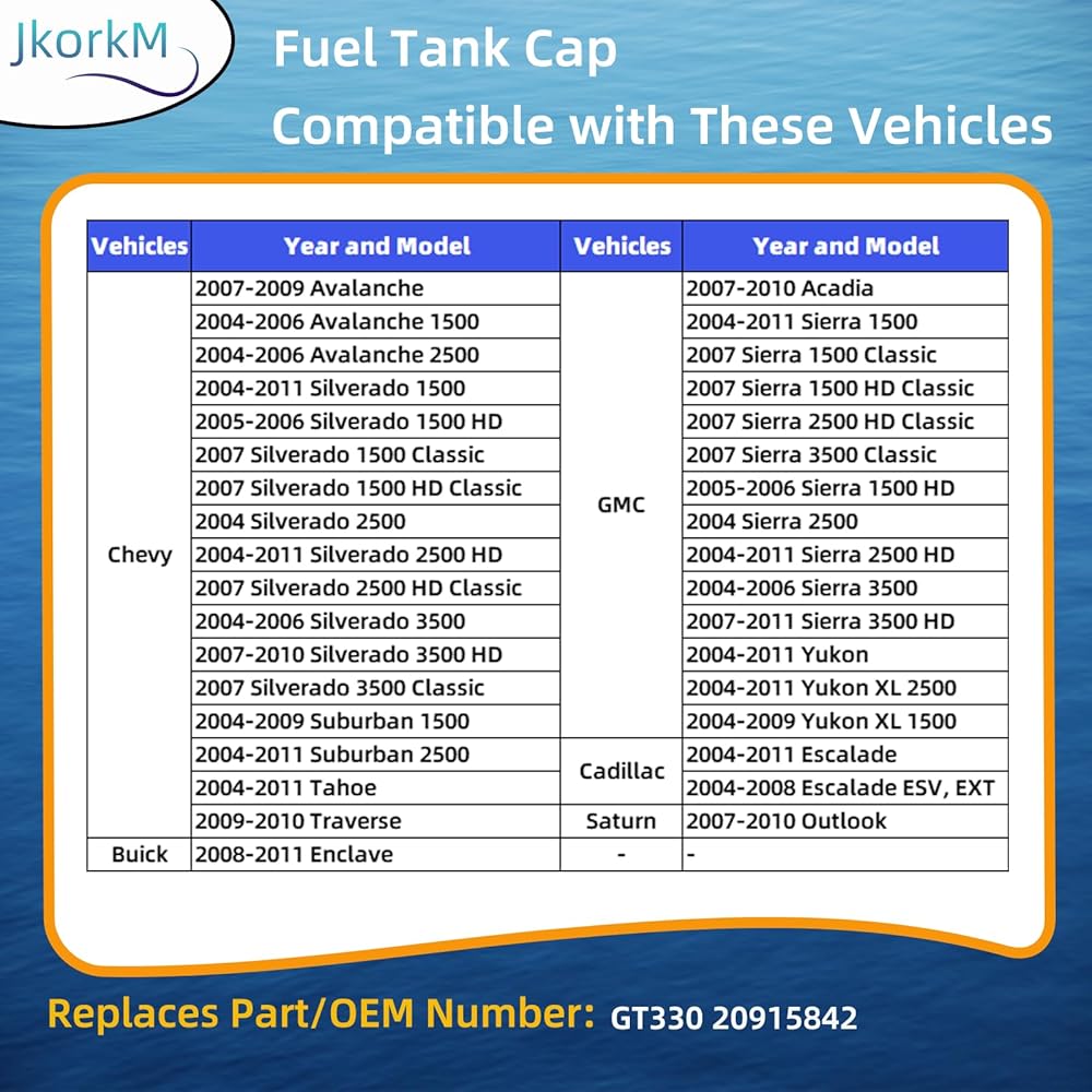 20915842 غطاء الغاز، غطاء الوقود يحل محل GT330 متوافق مع تشيفي جي إم سي كاديلاك ساتورن - أفالانش سيلفرادو سوبربان تاهو ترافيرس، أكاديا سييرا يوكون، بويك إنكليف، إسكاليد، أوتلوك...