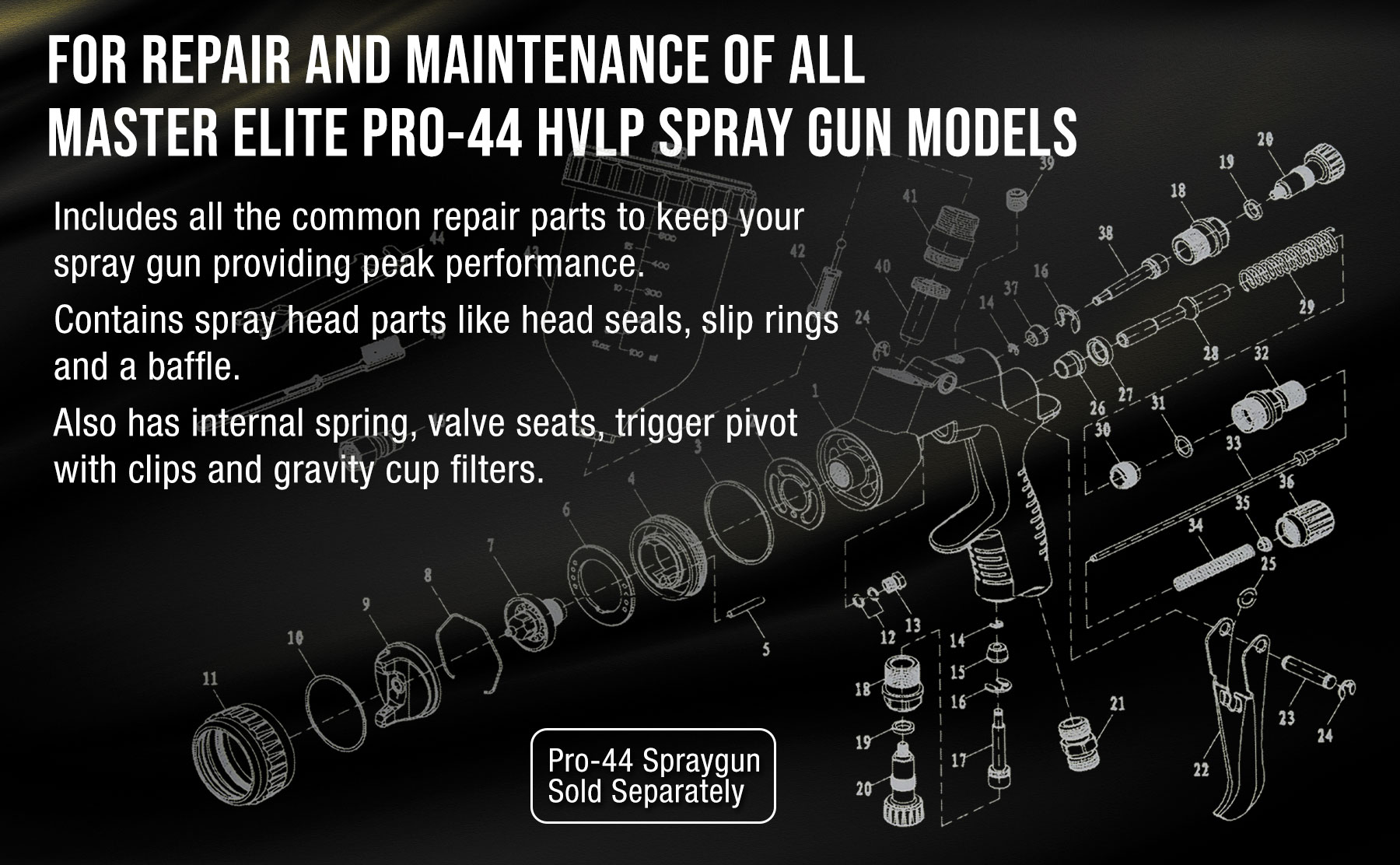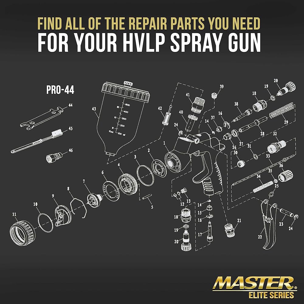 مجموعة أدوات إعادة بناء مسدس الرش HVLP عالية الأداء من سلسلة Master Elite PRO-44 # 1. مثالية لإصلاح وصيانة جميع موديلات مسدس الرش Master Elite PRO-44 HVLP.