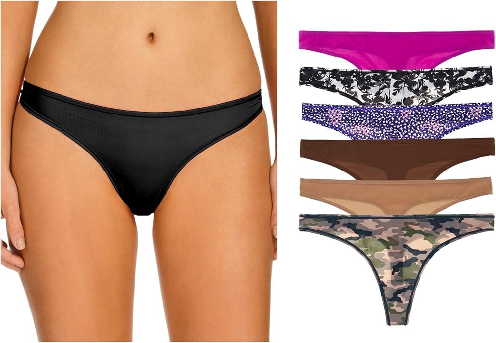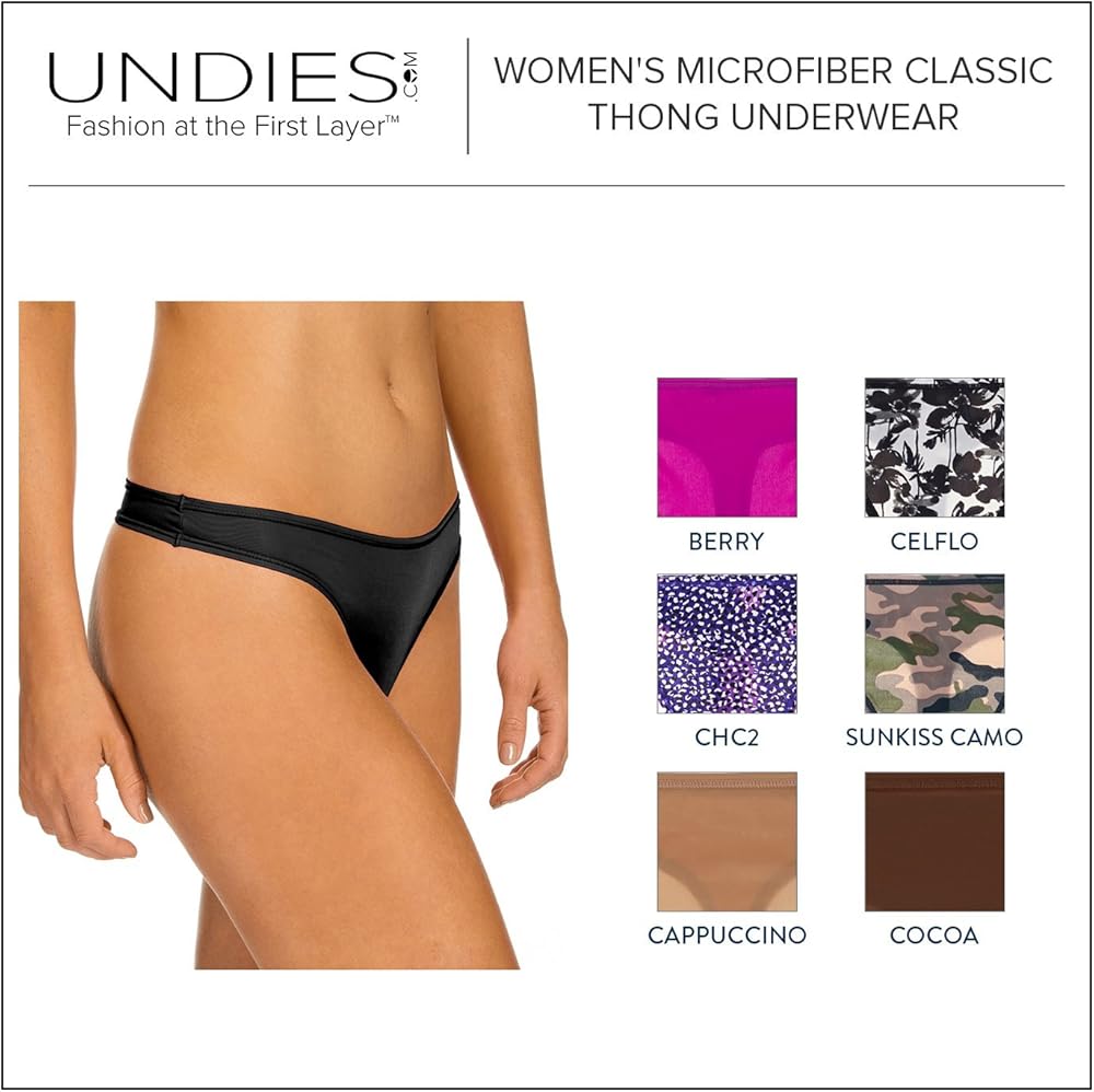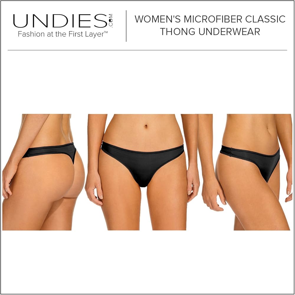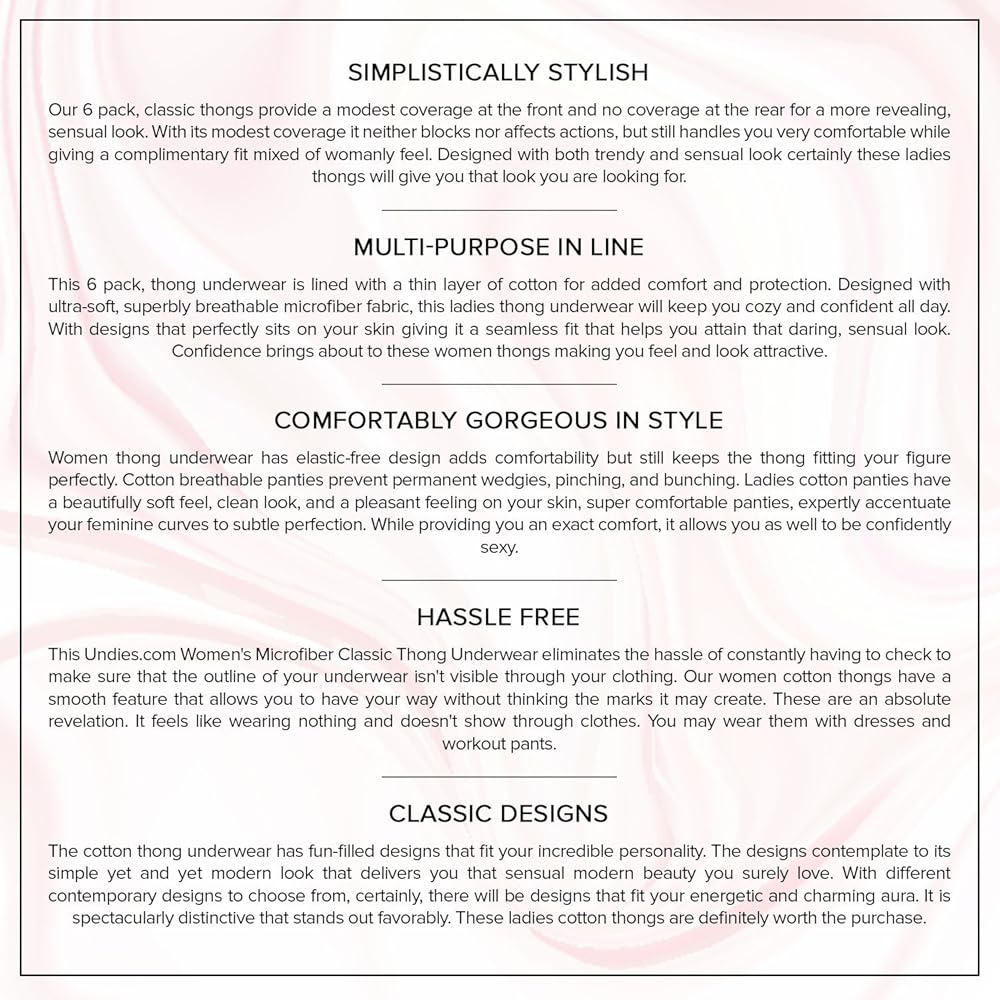 Undies Microfiber Classic Thong 6-Pack Underwear set comes with the classic microfiber thong in a lightweight super soft elastic-free the custom-knit fabric that is exactly what you're looking for from this forever favorite style It's the coverage you'd expect sometimes less is more If you fall between sizes we suggest sizing up Designed with both trendy and sensual look certainly these ladies thongs will give you that look you are looking for With designs that perfectly sits on your skin giving it a seamless fit that helps you attain that daring sensual look Confidence brings about to these women thongs making you feel and look attractive