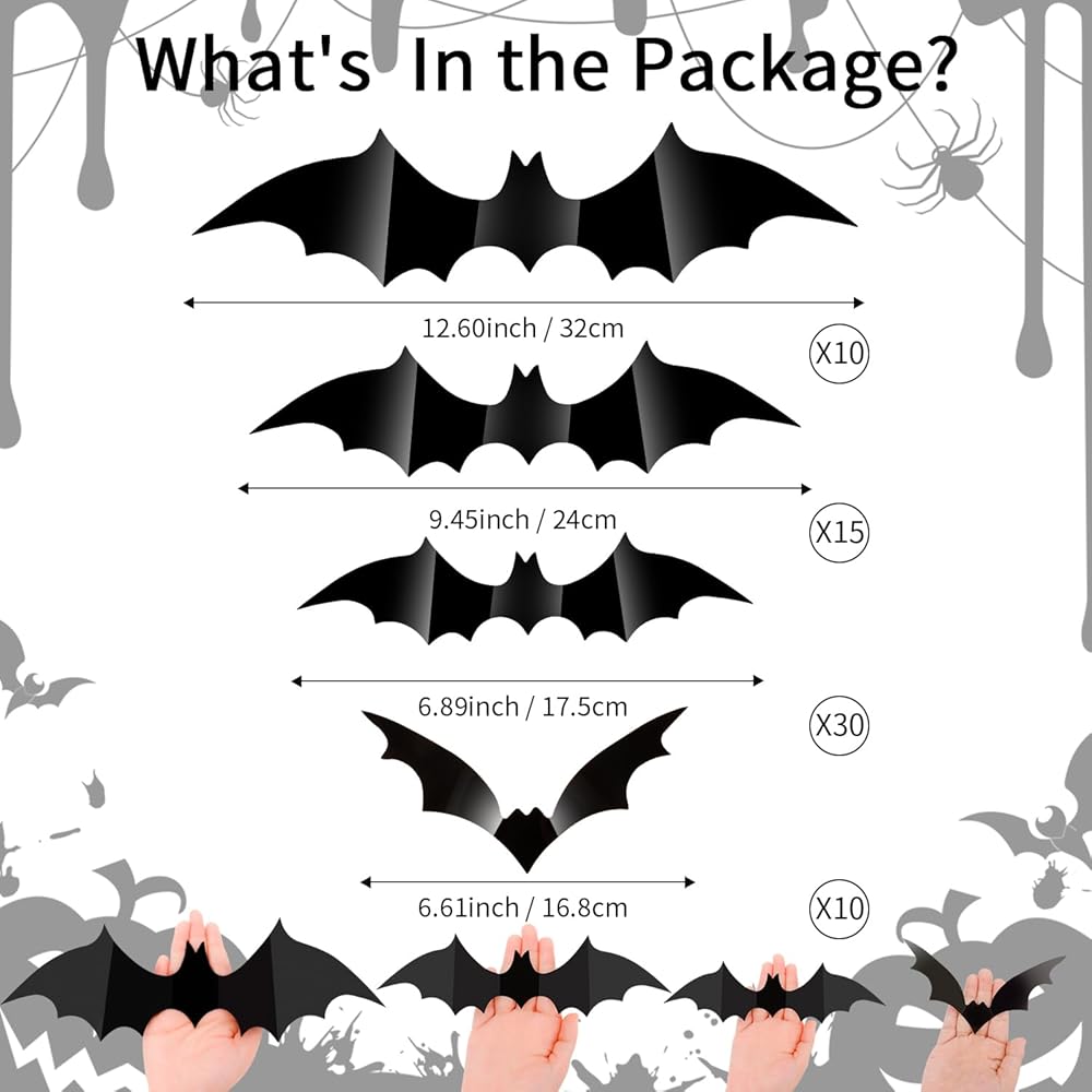 حجم مطور: مجموعة ملصقات الحائط الخفاش المزخرفة للهالوين تحتوي على 65 قطعة، وهي في 4 أحجام مختلفة، 10 قطع 12.6x3.5 بوصة، 15 قطعة 9.45x2.4 بوصة، 30 قطعة 6.89x1.6 بوصة و10 قطع 6.6x3.2 بوصة، والتي يمكن أن تلبي احتياجاتك المختلفة، اصنعها بنفسك في زوايا أجنحة مختلفة لإظهار مواقف الطيران المختلفة للخفافيش.
