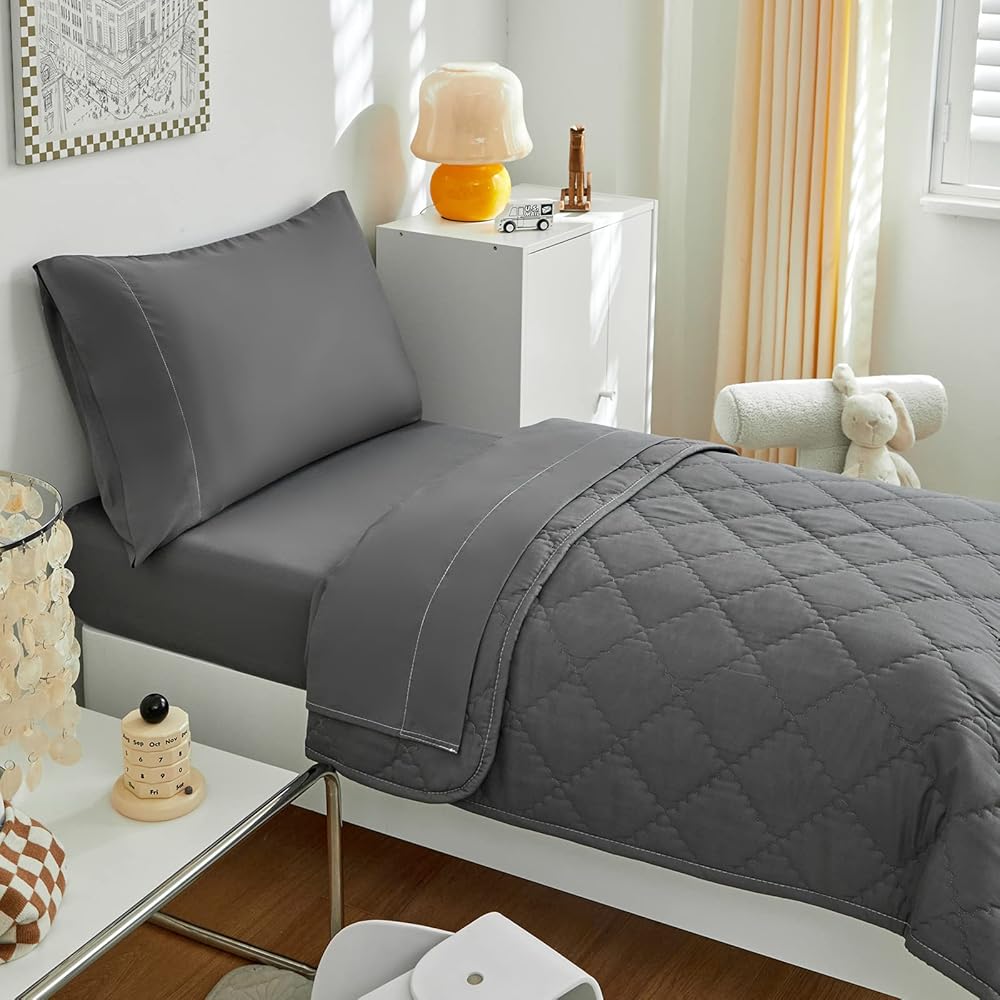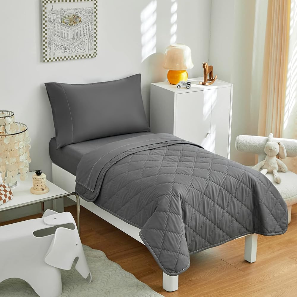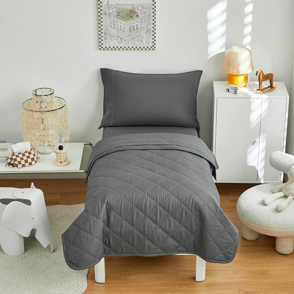 ما تحصل عليه: طقم فراش للأطفال مكون من 4 قطع يشتمل على: لحاف واحد ذو وجهين (42 بوصة × 57 بوصة)، 1 كيس وسادة ذو وجهين (20 بوصة × 30 بوصة)، 1 ملاءة علوية مسطحة (45 بوصة × 60 بوصة) و1 ملاءة سفلية مثبتة (28 بوصة × 52 بوصة × 8 بوصة). تم قياس جميع القطع لتناسب سرير الأطفال الصغار ذو الحجم القياسي.
