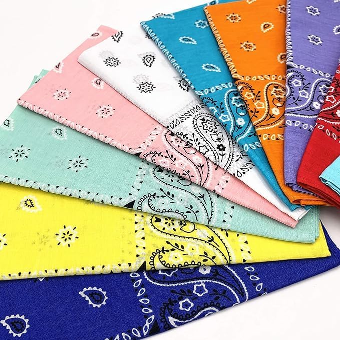 You will receive 12 bandanas 100% Cotton. Never fade or bleed in the wash. So feel free to put with your other clothes to wash together. Sewn on all 4 Sides. Fashionable colors! Can be worn on the face or head, around the neck or arms, use as the handkerchiefs, decorate your bag etc. 20 inches . Assortments May Vary