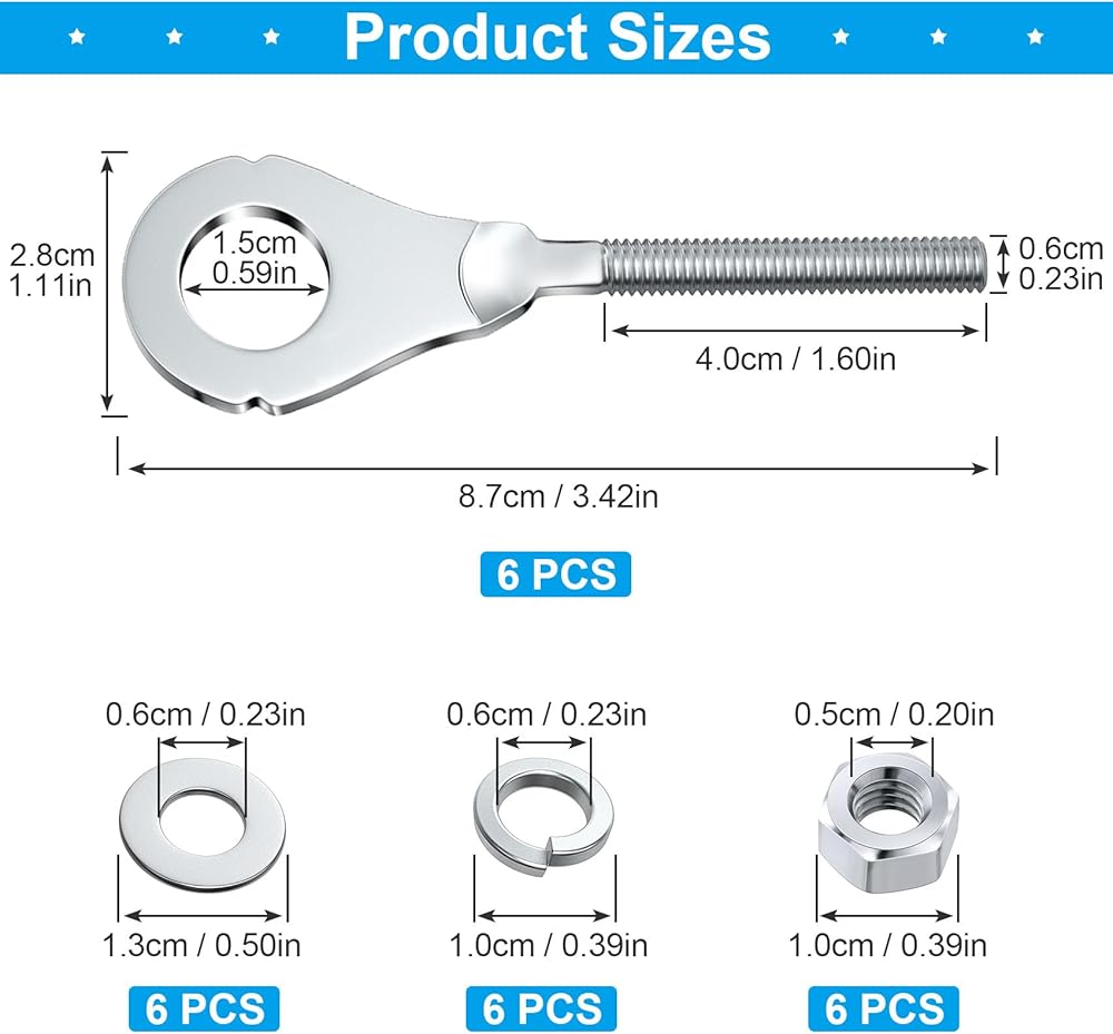 【العبوة】توجد 6 قطع أدوات ضبط شد سلسلة الدراجة الصغيرة + 6 قطع 1.3 سم/0.5 بوصة القطر الخارجي، 0.6 سم/0.23 بوصة حشوات القطر الداخلي + 6 قطع 1 سم/0.39 بوصة القطر الخارجي، 0.6 سم/0.23 بوصة حشوات القطر الداخلي + 6 قطع 1 سم/ القطر الخارجي 0.39 بوصة، صواميل 0.5 سم/0.2 بوصة.