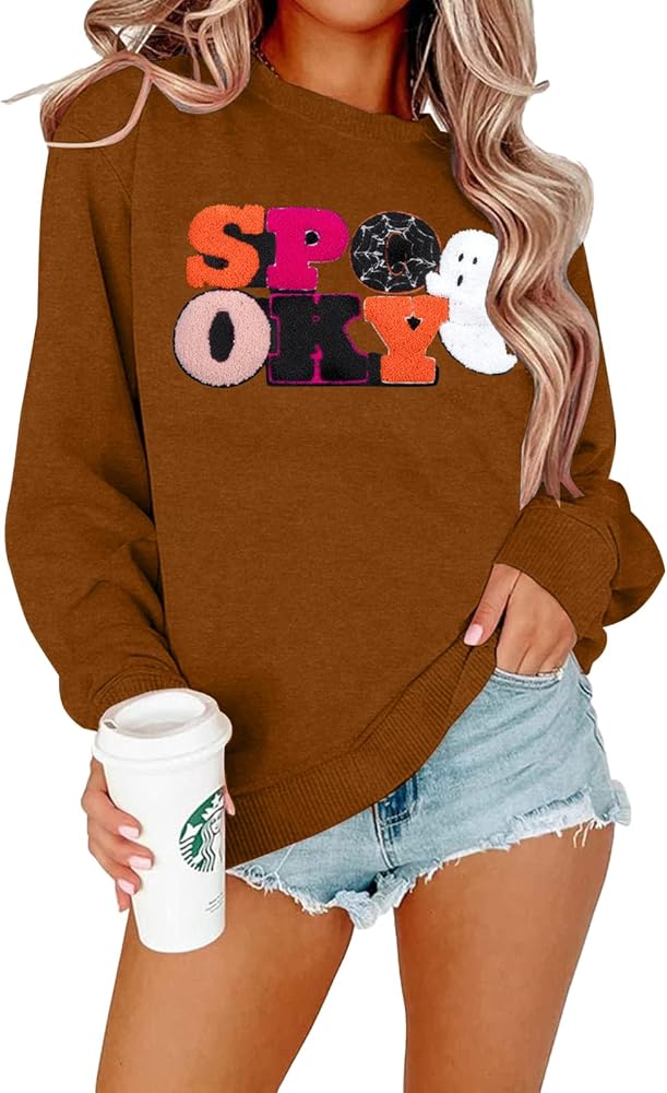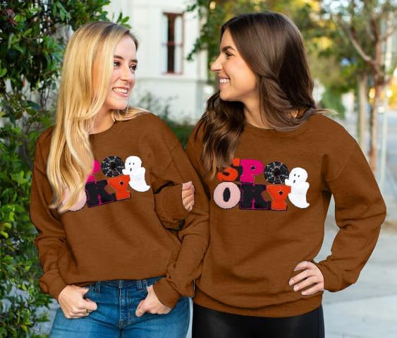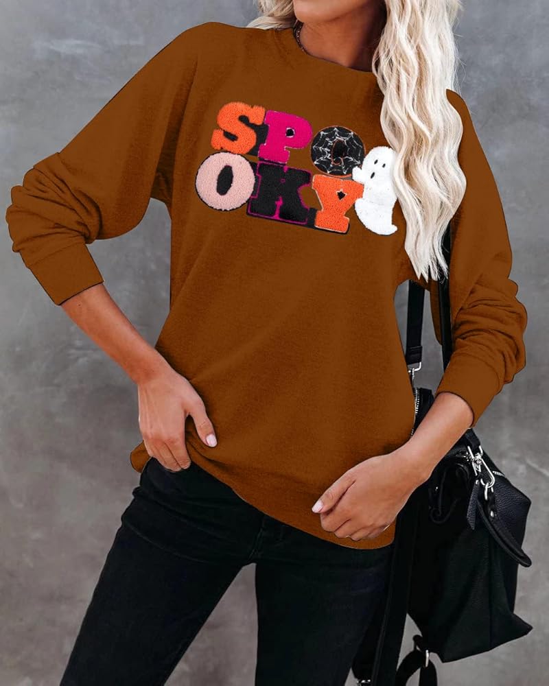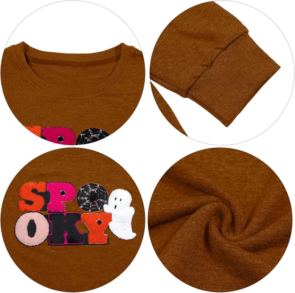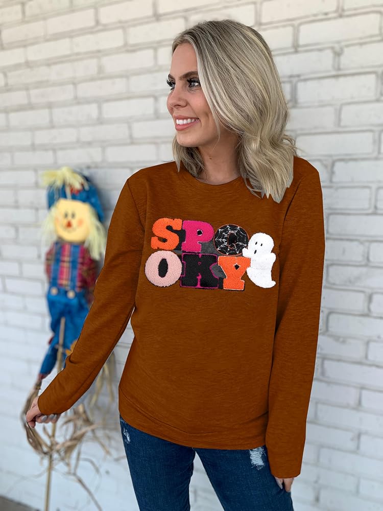 Halloween Spooky Sweatshirts Spooky Patch Pullover Halloween Sweatshirt for Women Fall Chenille Pullover Top