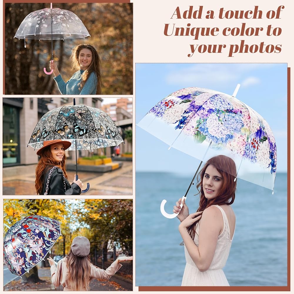 Our clear bubble umbrella's distinguished feature is its clear plastic material that provides you an unobstructed view of the picturesque outdoors, even when it's raining cats and dogs. Stand out from the drab with our vividly colored umbrella designs.