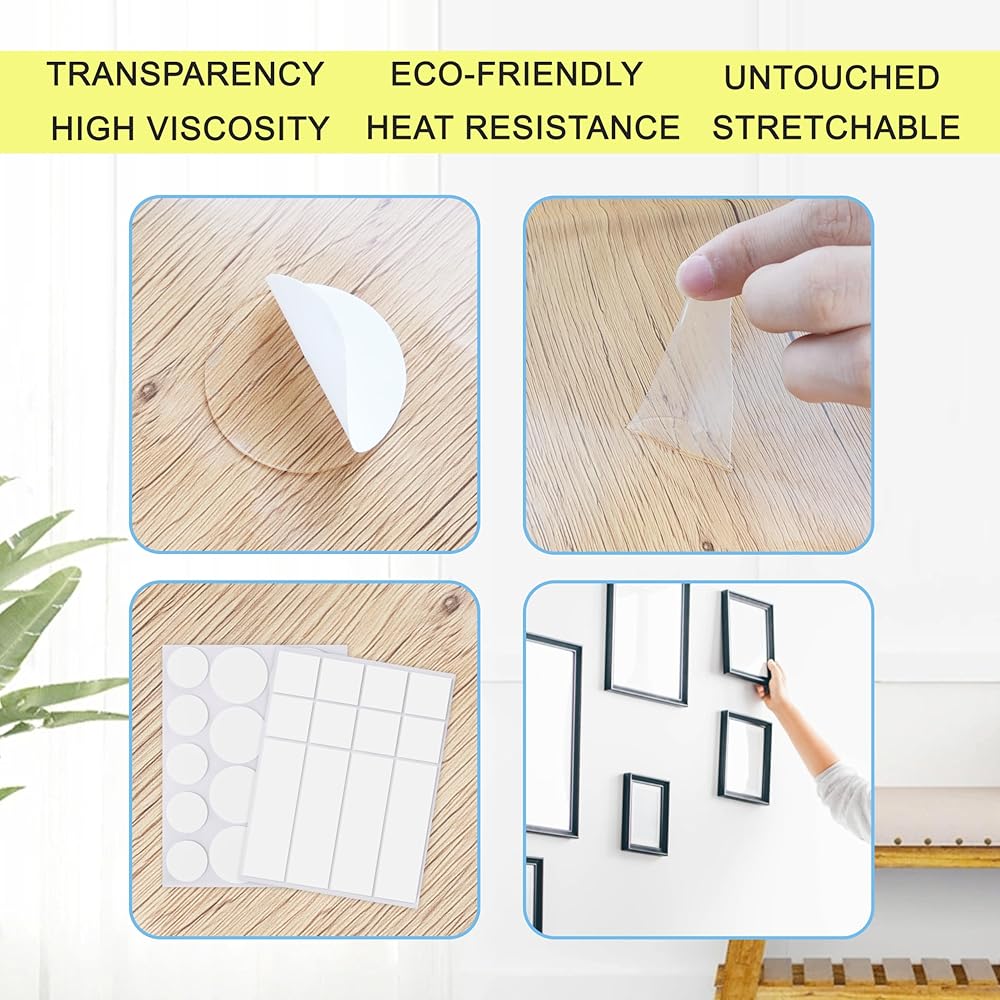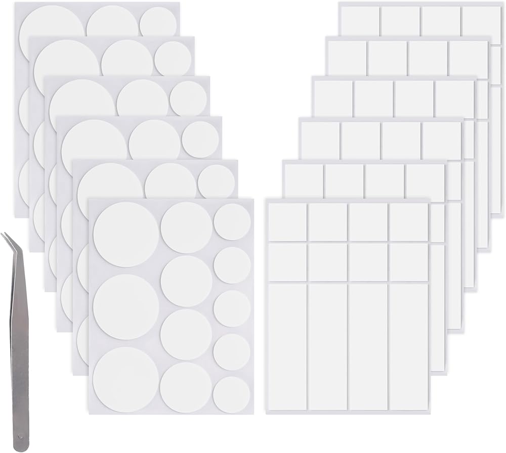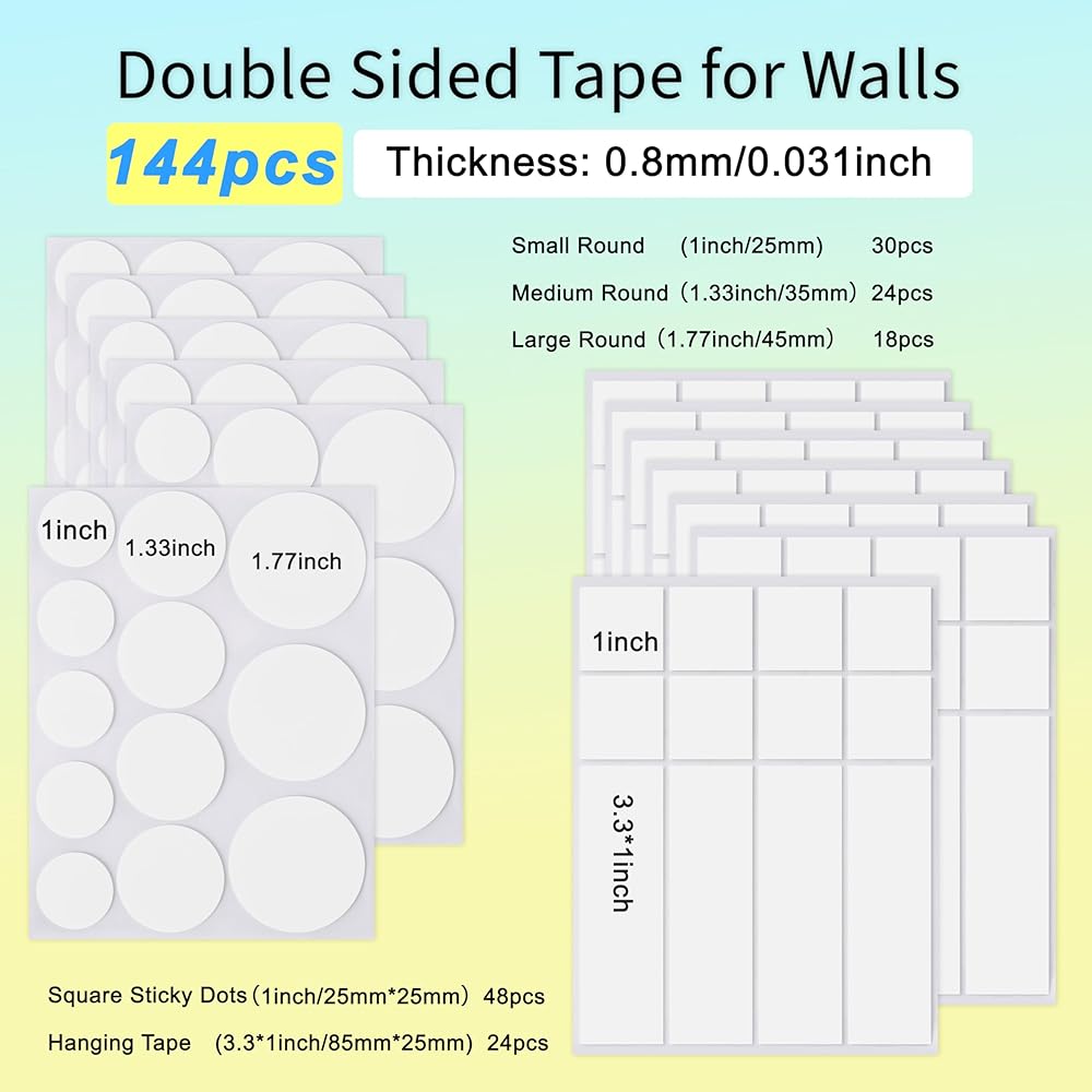 • What You'll Get: A set of clear sticky dots comprising circular sticky dots (25mm, 35mm, 45mm) totaling 72 pieces, square sticky dots (25mm25mm) totaling 48 pieces, and hanging strip tapes (85mm25mm) totaling 24 pieces, amounting to a total of 144 pieces. The thickness of the acrylic double sided tape is 0.8mm.