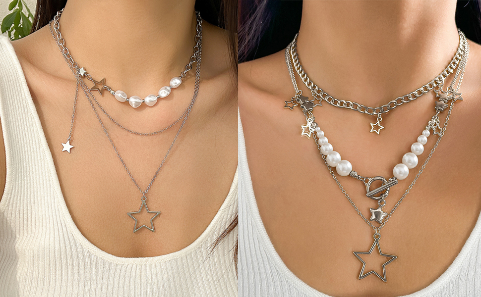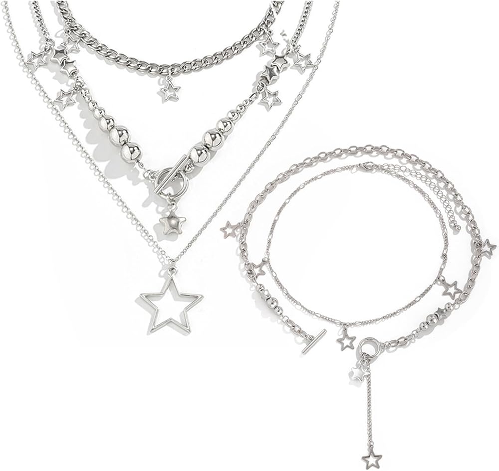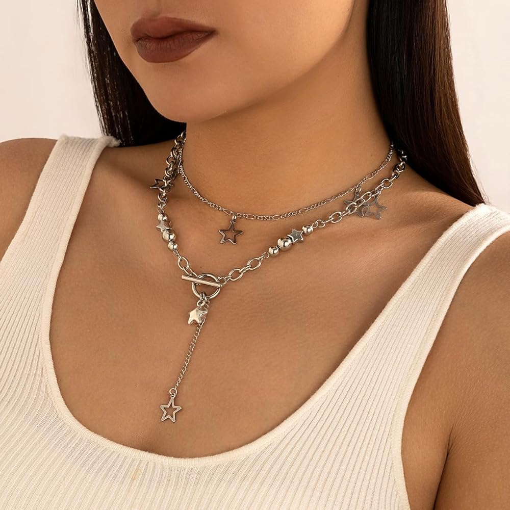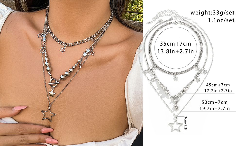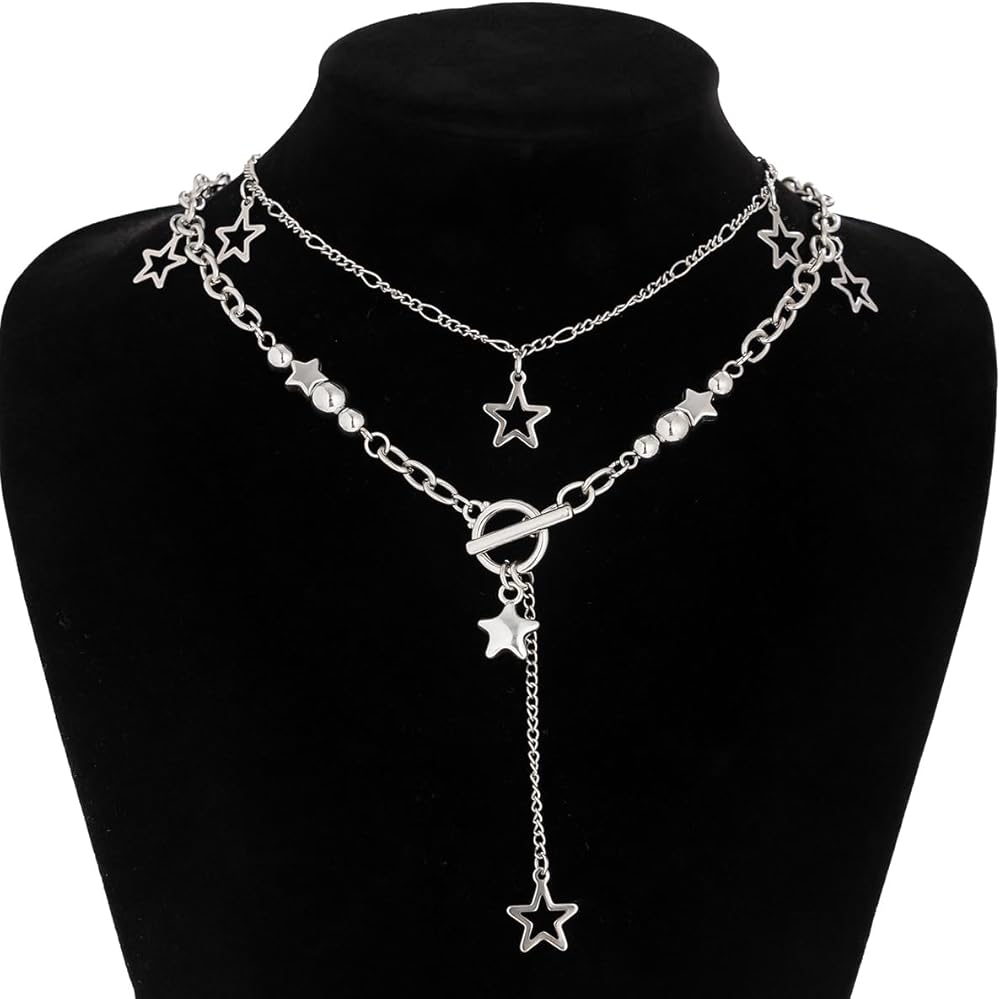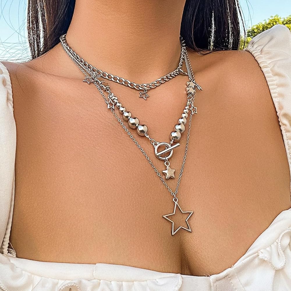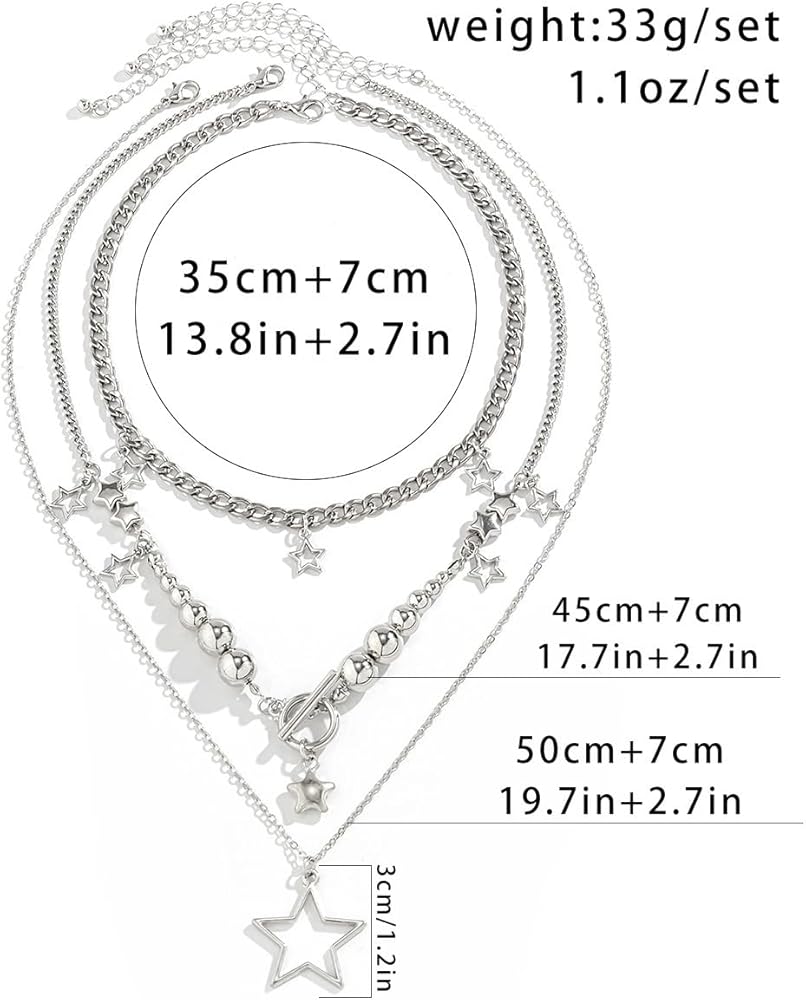 ⭐قلادة فضية مكتنزة⭐⭐هذه القلائد ذات الطبقات ليس من السهل أن تبهت، وآمنة على البشرة، وليس من السهل أن تسبب الحساسية. تم تصميم قلادة النجمة من إكسسوارات Y2K لتلتقط الضوء والتألق، مما يجعلك أكثر أناقة في عام 2018