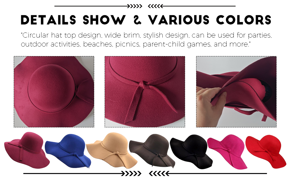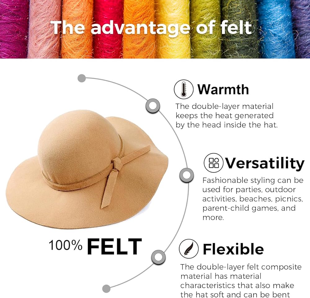• 5. ارتقي بأسلوبك مع قبعاتنا ذات الحواف العريضة، المثالية لإضافة لمسة من الرقي إلى أي ملابس. مصنوعة من لباد عالي الجودة وتتميز بتصميم دائري لا يتأثر بمرور الزمن، هذه القبعات تضفي سحرًا كلاسيكيًا لا تنتهي موضته أبدًا.